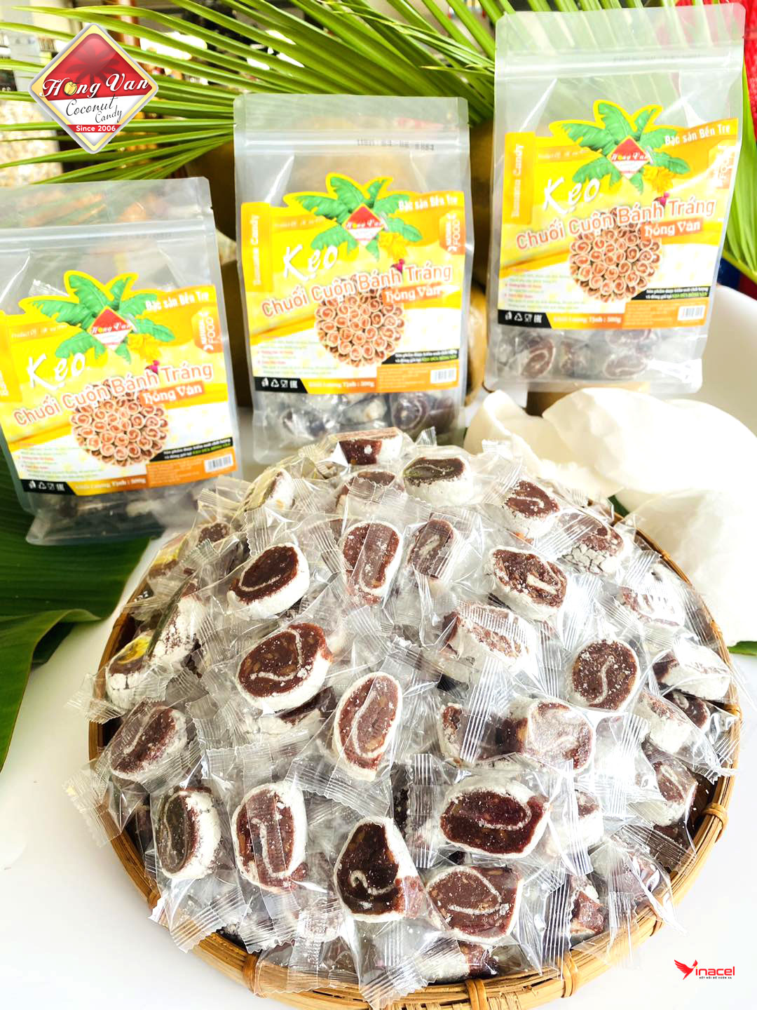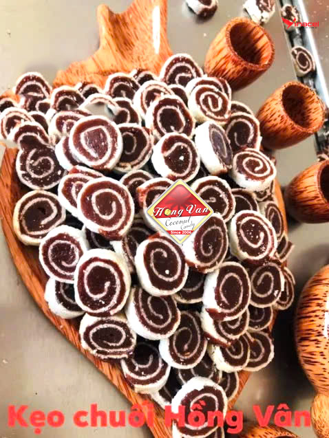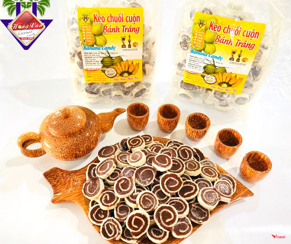 Kẹo chuối tươi cuộn bánh tráng là một trong những biến thể phổ biến nhất của kẹo chuối tươi Bến Tre. Với lớp bánh tráng dai mềm bên ngoài, bên trong là nhân chuối tươi được chế biến khéo léo, món kẹo này không chỉ mang lại hương vị thơm ngon mà còn có hình thức bắt mắt.