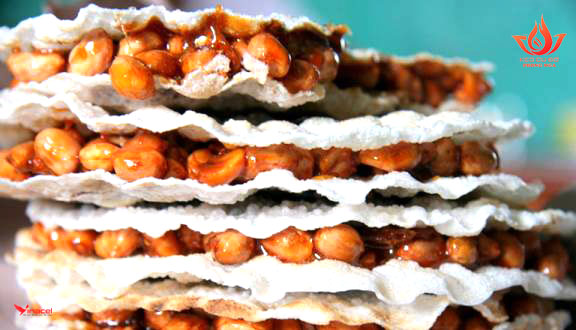 Đặt bánh tráng hoặc bánh đa lên đĩa, múc mật kẹo còn nóng thơm ngon gồm đậu phộng và gừng lên mặt bánh, dàn đều hỗn hợp ấy cho bằng phẳng và nhanh tay lấy miếng bánh tráng khác kẹp vào. Vậy là chúng ta đã hoàn thành xong món ăn vặt ngọt ngào - kẹo cu đơ rồi đấy!