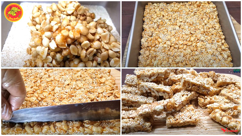 - Nấu kẹo: Các nguyên liệu đậu phộng đã sơ chế, đường, mạch nha sẽ được chuẩn bị theo tỷ lệ định sẵn. Đường và mạch nha sẽ được nấu cho đến khi chuyển sang màu vàng cánh gián thì cho đậu phộng vào. đảo đều để đường áo đều xung quanh đậu.