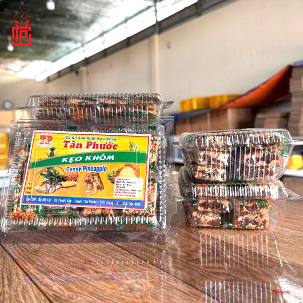 Kẹo sau khi được cắt thành viên sẽ trải qua bước đóng gói cẩn thận để giữ nguyên hương vị và chất lượng. Từng viên kẹo khóm Tân Phước được gói trong bao bì đẹp mắt, đảm bảo vệ sinh và thuận tiện cho việc bảo quản. Bao bì được thiết kế không chỉ nhằm bảo vệ kẹo khỏi môi trường bên ngoài mà còn giúp quảng bá thương hiệu kẹo khóm Tân Phước, một trong những đặc sản Tiền Giang đáng tự hào.