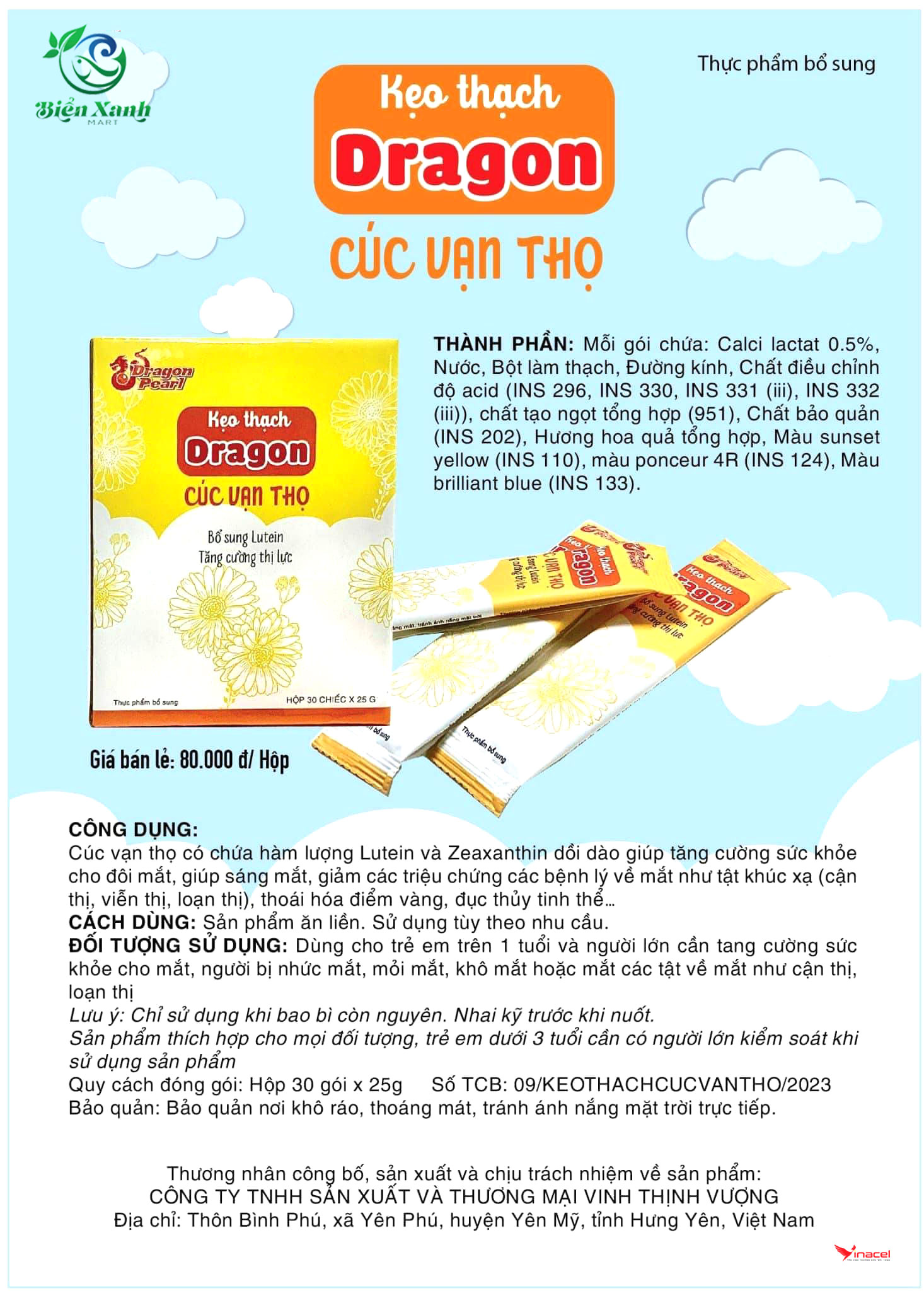 • Dragon: Cúc Vạn Thọ: Dùng cho trẻ em trên 1 tuổi và người lớn cần tăng cường sức khỏe cho mắt, người bị nhức mắt, mỏi mắt, khô mắt hoặc mắc các tật về mắt như cận thị, loạn thị.