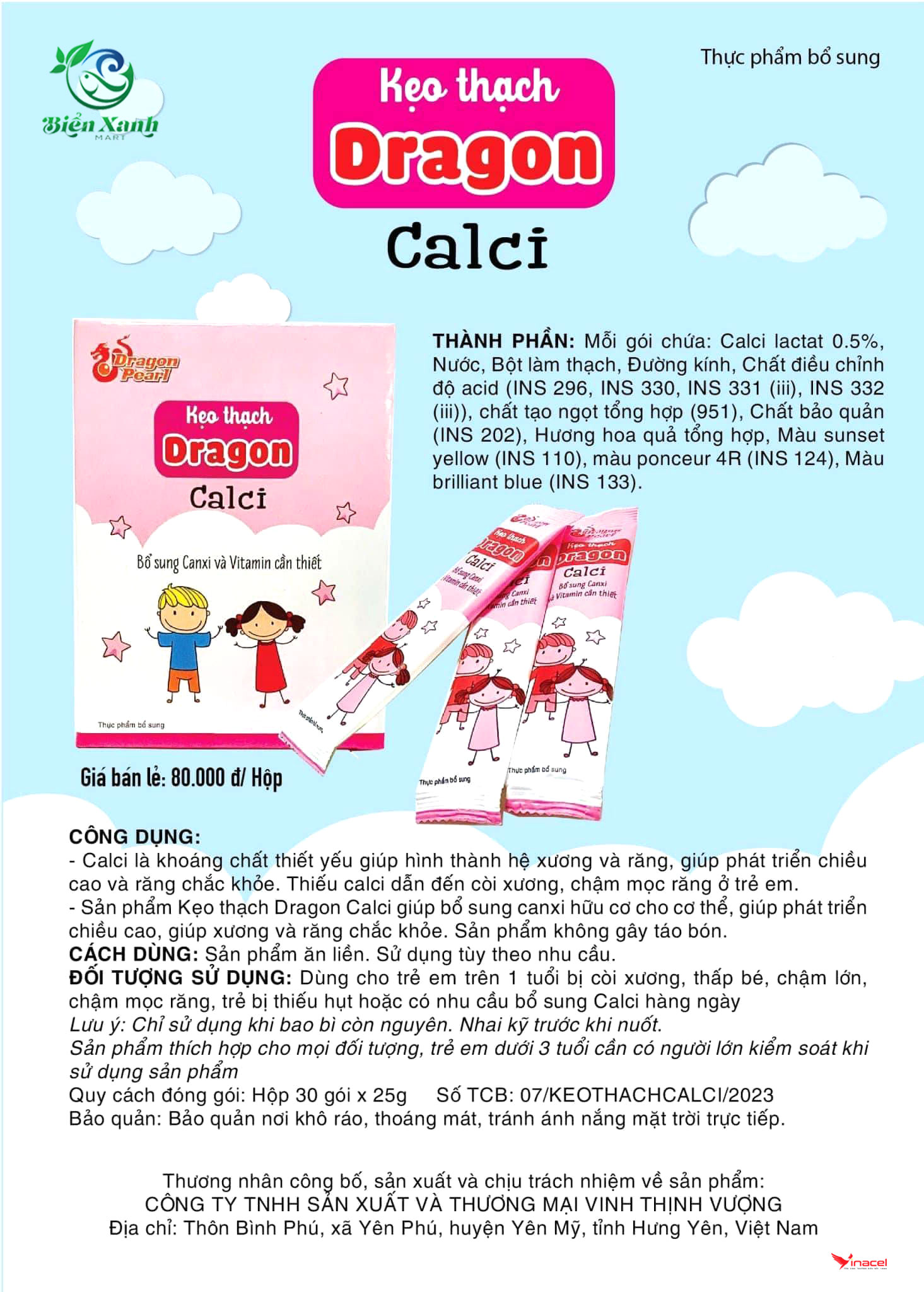 • Dragon Calci: Dùng cho trẻ em trên 1 tuổi bị còi xương, thấp bé, chậm lớn, chậm mọc răng, trẻ bị thiếu hụt hoặc có nhu cầu bổ sung calci hàng ngày.