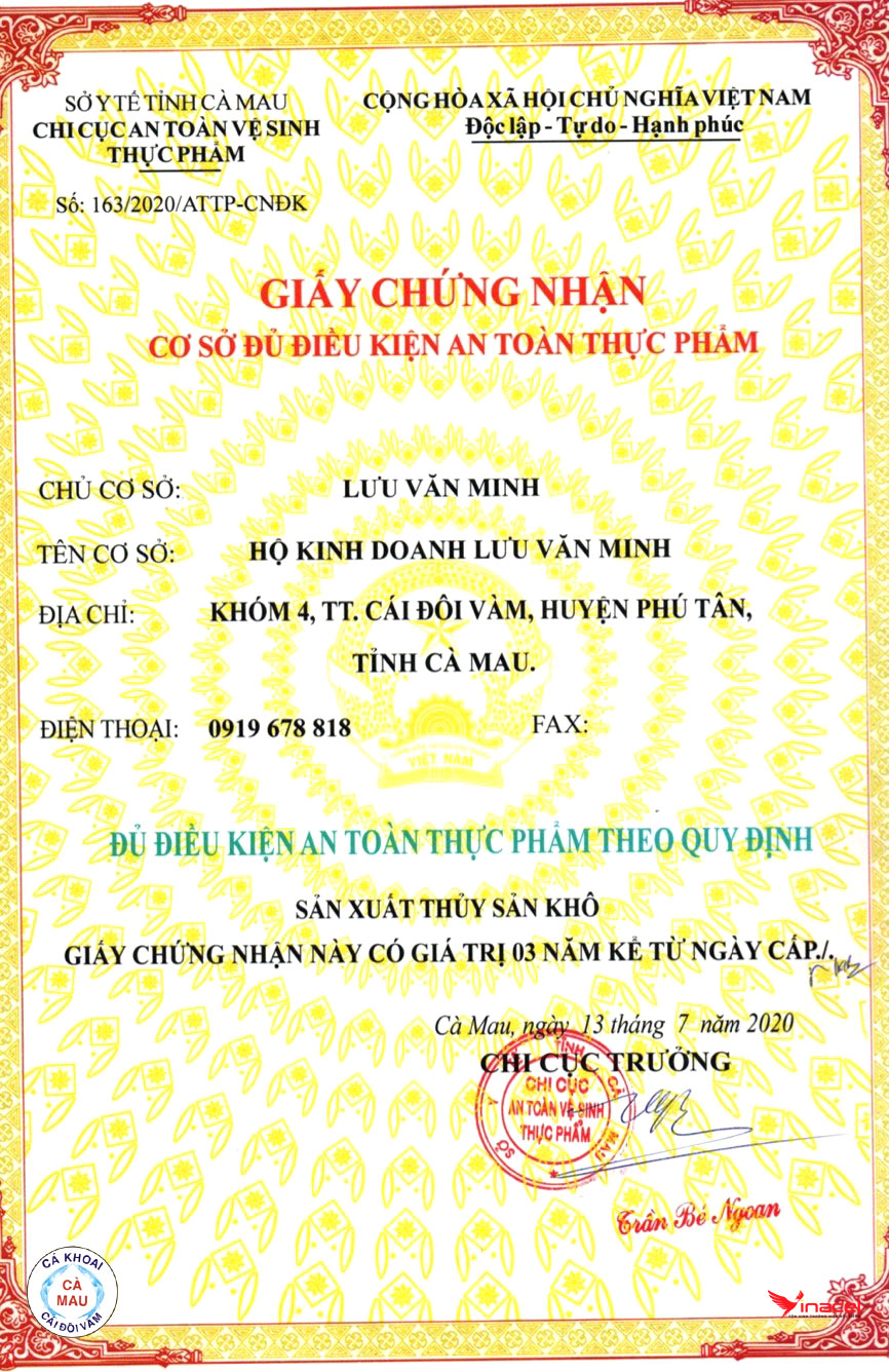 Hộ kinh doanh Lưu Văn Minh là một trong những cơ sở tiêu chuẩn sản xuất sản phẩm Khô Cá Khoai tiêu biểu tại Cái Đôi Vàm, huyện Phú Tân. Được chứng nhân là cơ sở đủ điều kiện an toàn thực phẩm theo quy định sản xuất thuỷ sản khô, Hộ kinh doanh cam kết chế biến và phân phối những sản phẩm Khô Cá Khoai Hoàng Phúc đạt chất lượng cao, đảm bảo vệ sinh an toàn thực phẩm và sức khoẻ của người tiêu dùng.