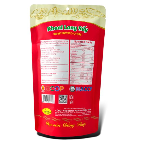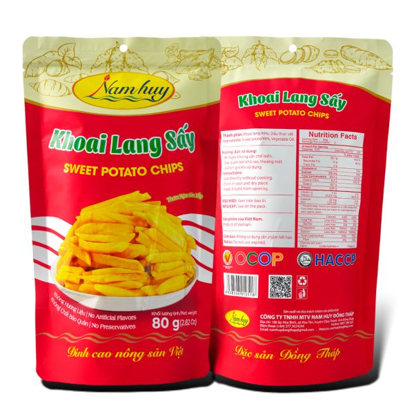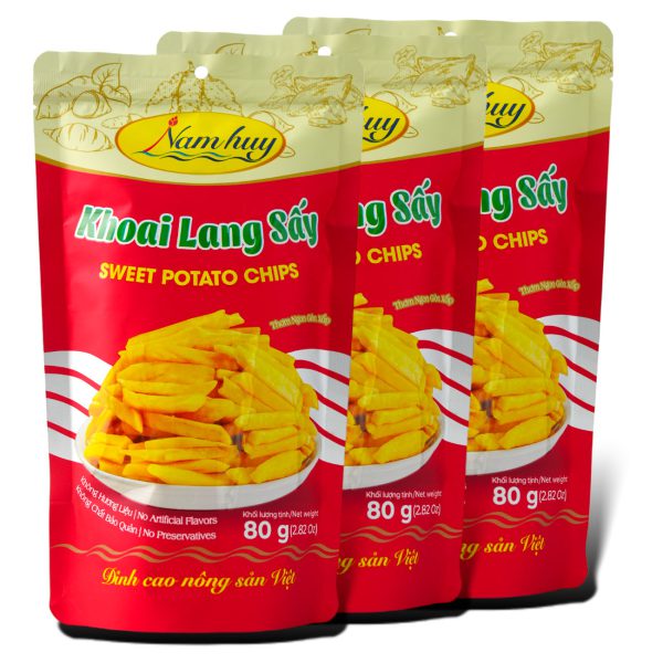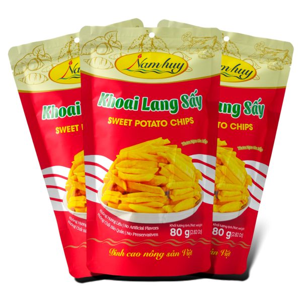 Sản phẩm được sản xuất từ dây chuyền công nghệ hiện đại, đảm bảo an toàn vệ sinh thực phẩm, nhưng vẫn giữ được màu sắc, hương vị tự nhiên của khoai lang tươi và đặc biệt không dùng hóa chất trong qui trình sản xuất. “Khoai lang sấy Nam Huy” đặc sản truyền thống của quê hương dựa trên tiêu chí sạch, an toàn, đảm bảo sức khỏe cho cộng đồng.
