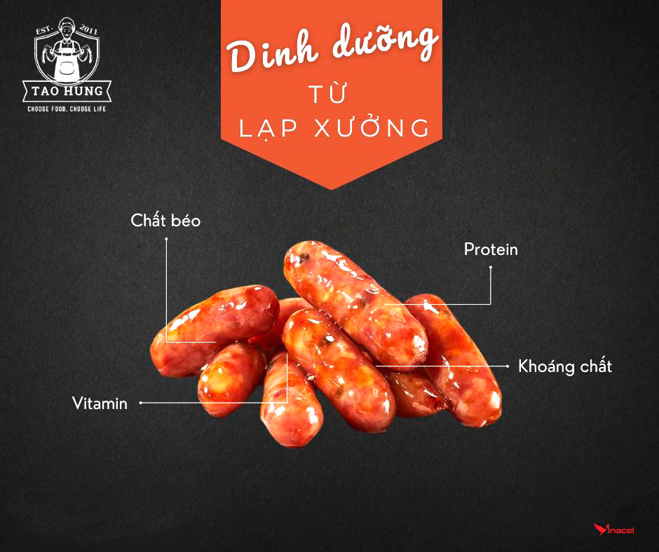 Lạp xưởng được làm từ thịt, trong thị có rất nhiều protein trong 200g có 54g protein Protein có vai trò cấu tạo, duy trì và phát triển cơ thể, hình thành những chất cơ bản phục vụ cho hoạt động sống.