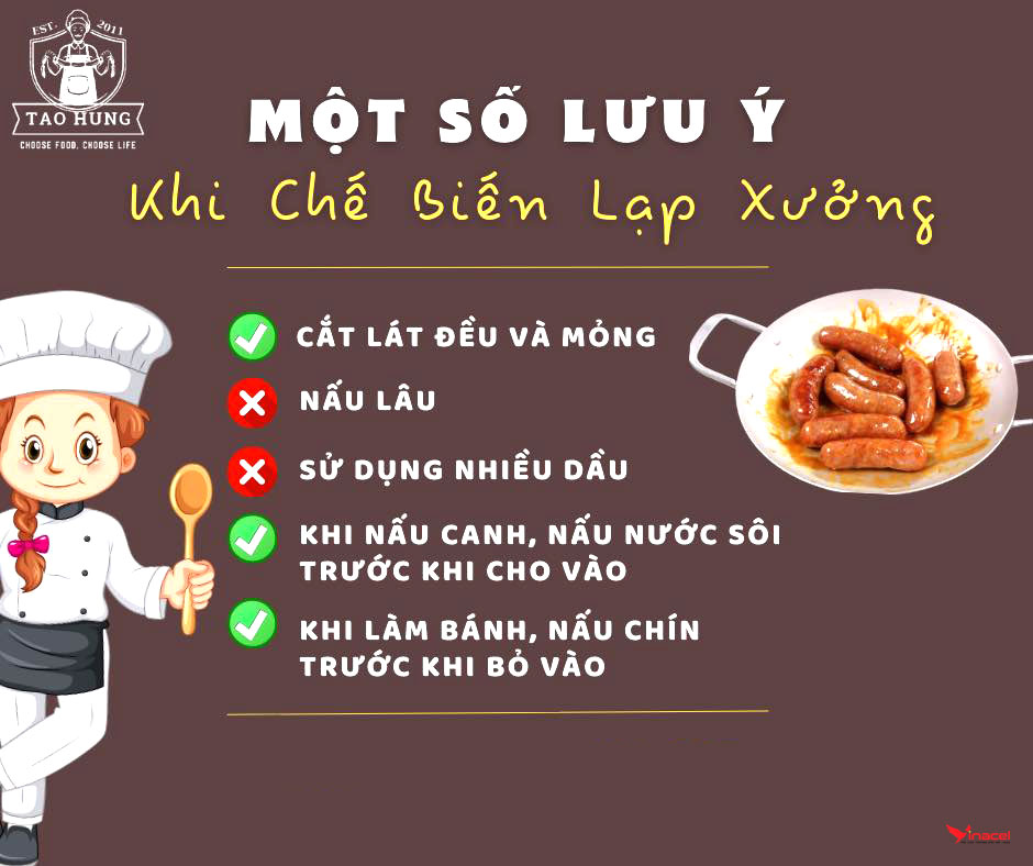 • Cuối cùng, để hạn chế lượng calo trong lạp xưởng bạn nên áp dụng các phương pháp chế biến không dầu mỡ thay vì chiên rán.