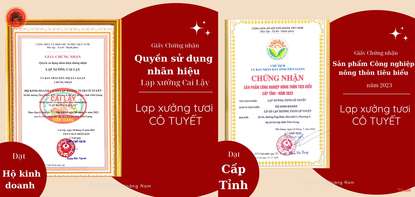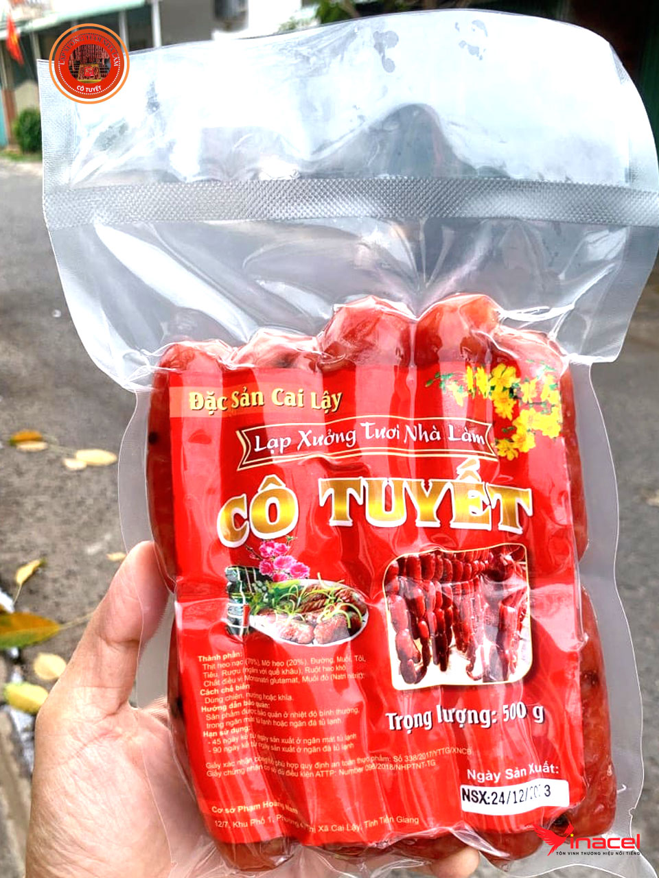 Thương hiệu được đăng ký bản quyền. Xác nhận của cục vệ sinh An toàn Thực Phẩm. Sản phẩm “Lạp xưởng Cô Tuyết” được phòng Kinh Tế huyện Cai Lậy giới thiệu trưng bày ở hội chợ triển lãm thành tựu kinh tế tỉnh Tiền Giang ngày 30/04/2015.