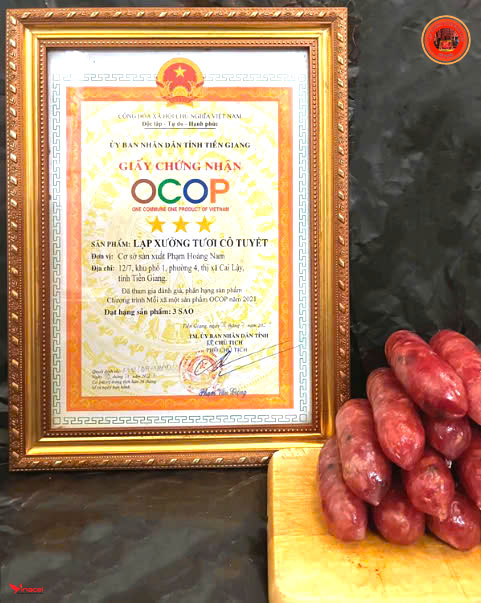 Nay sản phẩm được phòng Kinh Tế thị xã Cai Lậy đang xúc tiến giới thiệu mỗi phường một sản phẩm. Lạp Xưởng Cô Tuyết - Cở sở Phạm Hoàng Nam được cấp giấy chứng nhận “ Cơ sở đủ điều kiện An Toàn Thực Phẩm” - Số cấp :” / Number: 096/2018/NNPTNT.TG”.
