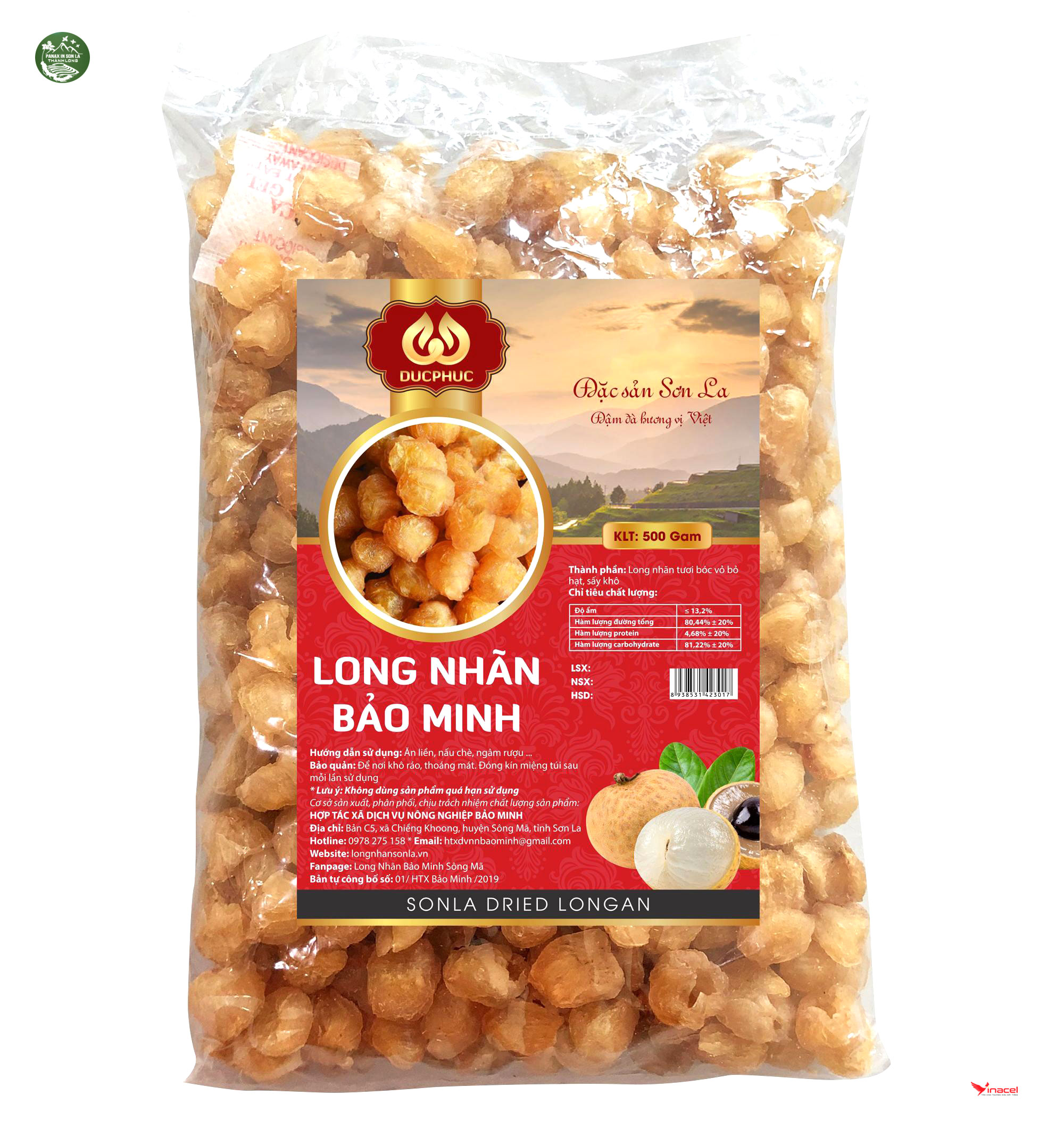 - Nhãn của HTX Bảo Minh được sản xuất từ 100% cùi quả nhãn tươi sấy khô, từ các loại nhãn Sông Mã nổi danh như nhãn miền, nhãn chín sớm, nhãn chín muộn, nhãn chất lượng đạt chỉ tiêu xuất khẩu.
