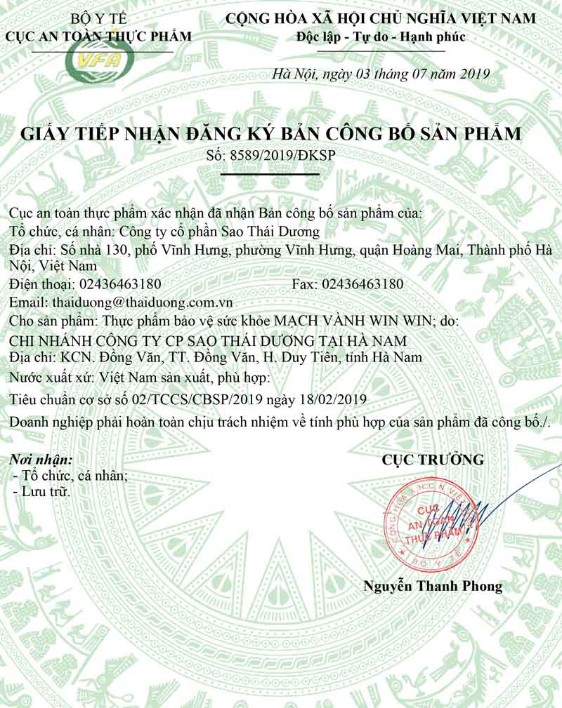 Viên uống Mạch Vành Win Win Sao Thái Dương có đăng ký đầy đủ thông tin tại Cục an toàn thực phẩm – Bộ Y tế, đảm bảo nguồn gốc sản phẩm rõ ràng để khách hàng yên tâm lựa chọn.