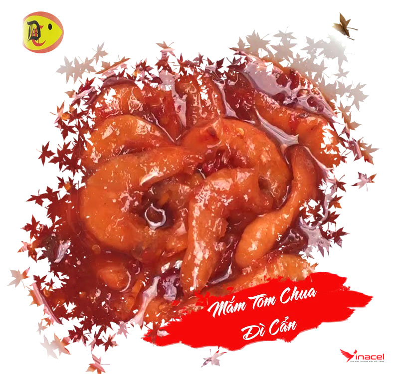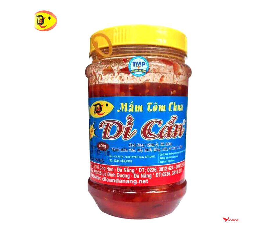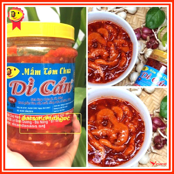 Mắm tôm chua chính là kết quả của quá trình lên men đặt biệt. Tôm phải được ủ đúng công thức thì mới có màu đỏ rực, kết hợp với riềng, ớt sẽ tạo vị chua ngọt, hăng hăng cực kì ngon. Mắm tôm chua Dì Cẩn là đặc sản nổi tiếng của Đà Nẵng, được rất nhiều khách du lịch tìm mua về làm quà khi có dịp đến với Đà Nẵng.