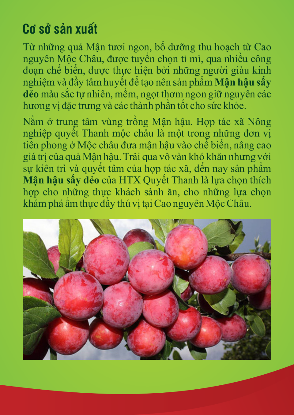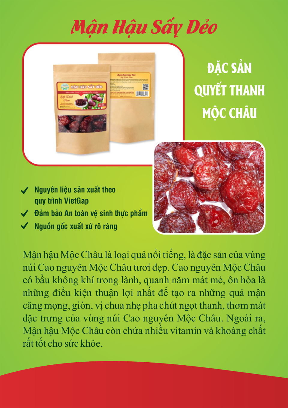 Mận Hậu sấy dẻo được chế biến từ những quả mận hậu Mộc Châu tươi ngon nhất. Được trồng theo tiêu chuẩn Vietgap. Quy trình sản xuất hiện đại, đảm bảo vệ sinh an toàn thực phẩm.