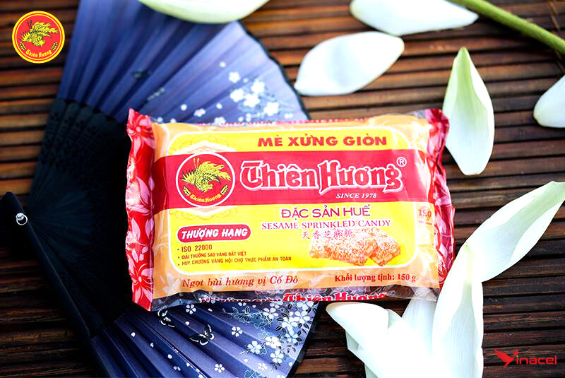 Nhâm nhi miếng mè xứ Huế với một tách trà sen nóng sẽ cảm nhận rõ hơn hương vị đất trời. Sản phẩm Mè xửng Thiên Hương thượng hạng đóng túi đẹp mắt và rất sang trọng, đây là sản phẩm mè xửng cao cấp thượng hạng thích hợp cho các gói quà tặng cao cấp. Thương hiệu mè xửng Thiên Hương có nguồn gốc lâu đời, với những sản phẩm mè xửng chất lượng và an toàn cho sức khỏe.