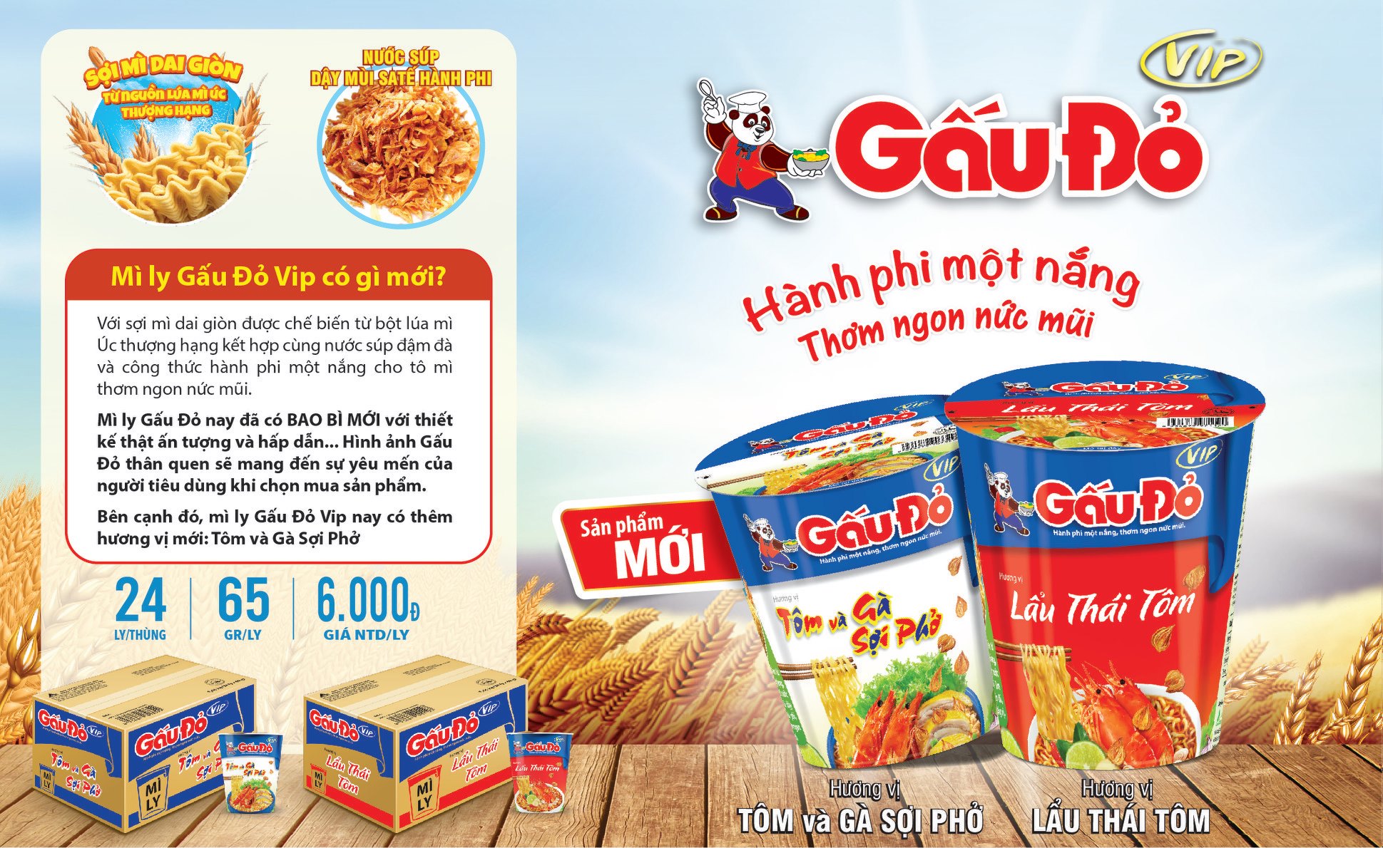 Tiếp nối sự thành công của mì Gấu Đỏ gói hương vị hành phi một nắng thơm ngon nức mũi đã tạo ra tô mì thơm ngon đặc biệt được người tiêu dùng yêu thích và tin dùng. Công ty Thực phẩm Á Châu đã cho ra đời sản phẩm mì ly cao cấp Gấu Đỏ VIP với 2 hương vị thơm ngon, hấp dẫn đó là: Gà hành phi và lẩu Thái tôm.