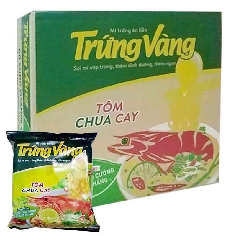 Mì trứng ăn liền hương vị tôm chua cay thuộc thương hiệu Trứng Vàng được làm từ bột mì cao cấp cùng hương vị tôm mang đến vị thơm ngon đặc trưng cho bữa ăn của gia đình bạn. Bên cạnh đó, thành phần trứng có trong mì chứa ovalbumin, lecithin tăng độ giòn và bóng mượt cho sợi mì mang đến cho bạn những bữa ăn thơm ngon và hấp dẫn hơn. Mì trứng ăn liền hương vị tôm chua cay Trứng Vàng cung cấp nhiều dưỡng chất và năng lượng cần thiết cho cơ thể của bạn.