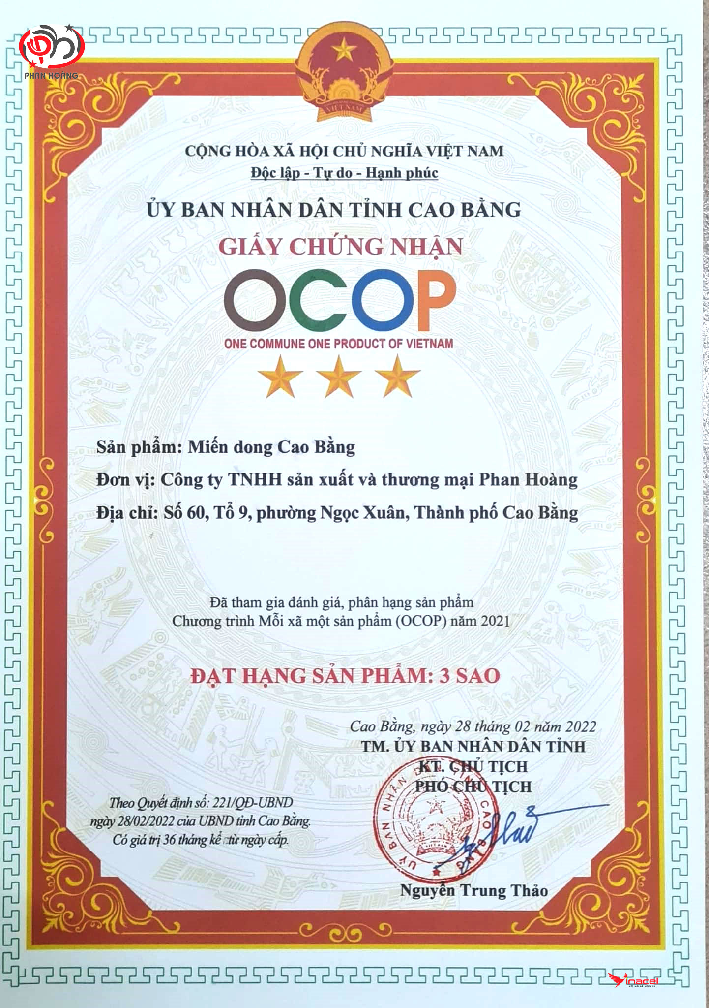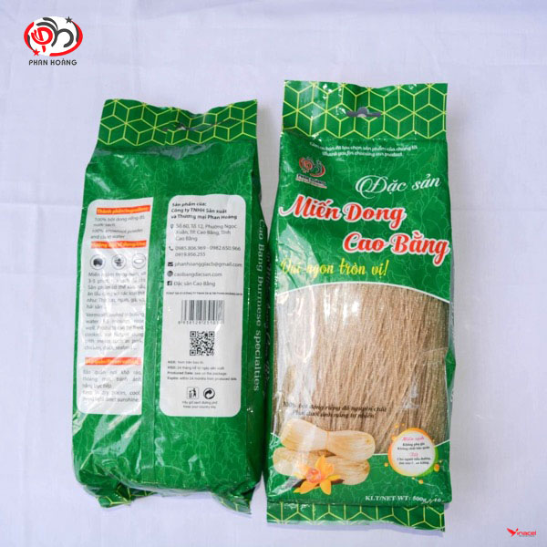 Miến dong Cao Bằng thương hiệu "Phan Hoàng" được sản xuất và phân phối bởi công ty TNHH sản xuất và thương mại Phan Hoàng. Sản phẩm được sản xuất từ 100% bột dong giềng đỏ nguyên chất, cây dong giềng đỏ được trồng tại xã Phia đén, huyện Nguyên Bình, tỉnh Cao Bằng. Sản phẩm đảm bảo an toàn vệ sinh thực phẩm, không phẩm mầu, chất phụ gia, bảo quản.