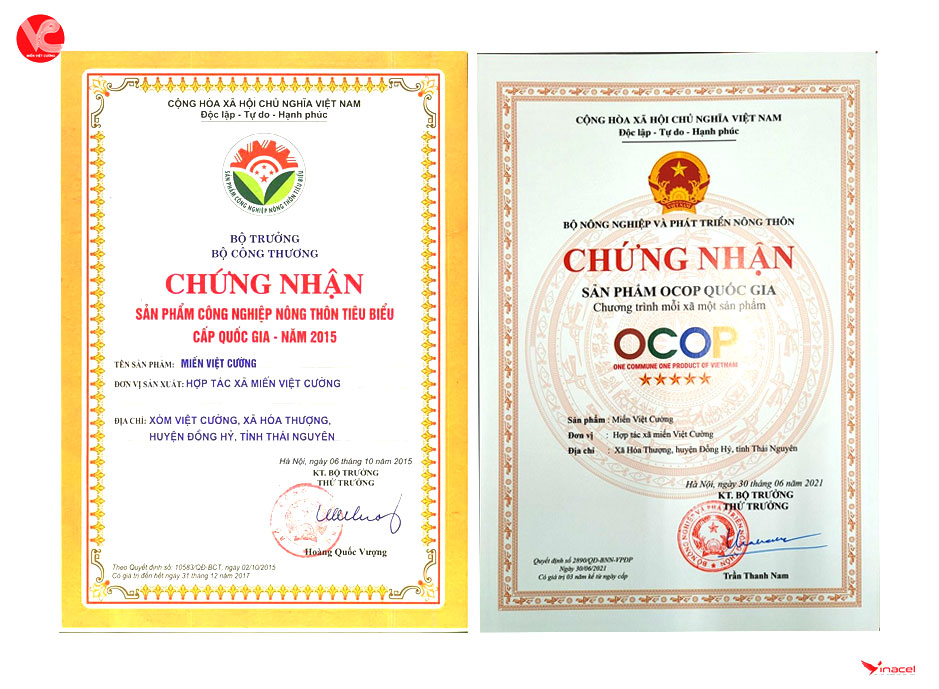 Bên cạnh đó, miến dong Việt Cường còn được nhiều tổ chức uy tín trong và ngoài nước công nhận về chất lượng sản phẩm. Sản phẩm đã nhận nhiều giải thưởng và chứng nhận như: