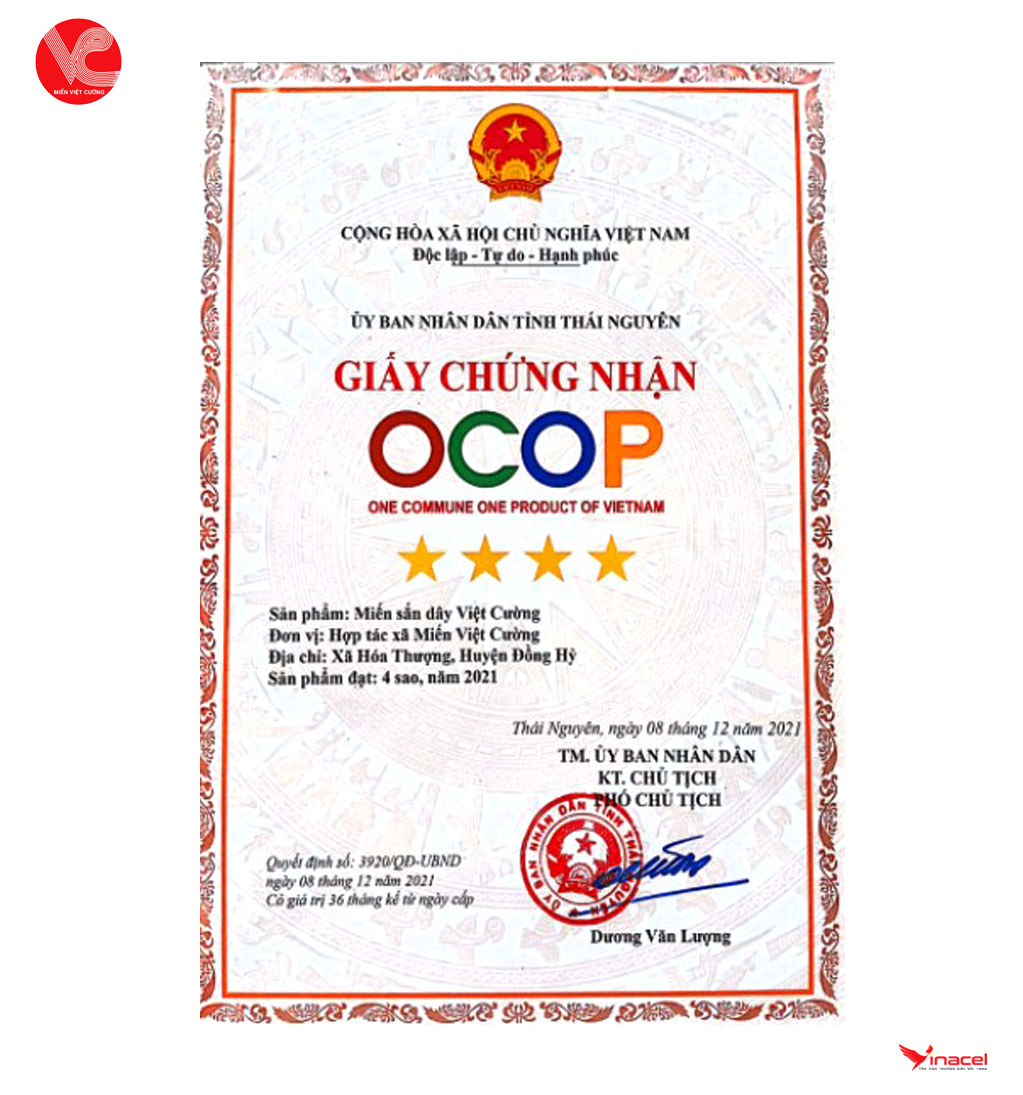 Miến Sắn Dây Việt Cường là đặc sản được chứng nhận OCCOP 5 sao của Thái Nguyên. TẤT CẢ CÁC SẢN PHẨM OCCOP 5 SAO ĐỀU ĐẠT ĐỦ TIÊU CHUẨN XUẤT KHẨU (rõ ràng về nguồn gốc và chất lượng). Miến được làm từ tinh bột sắn dây và tinh bột dong riềng cho sợi miến dai ngon, giòn chắc và không bị nát khi nấu. Từ đó mang đến sự trọn vẹn trong hương vị khi thưởng thức.