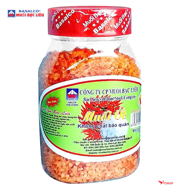 Sản phẩm Muối Ớt Bạc Liêu được Công ty cổ phần muối Bạc Liêu sản xuất từ nguồn nguyên liệu sạch, trên dây chuyền chế biến đạt an toàn vệ sinh thực phẩm và các yêu cầu quản lý chất lượng, sản xuất theo TCCS, QCVN 8-2:2011/BYT, TCVS theo quyết định số 46/2007/QĐ-BYT.