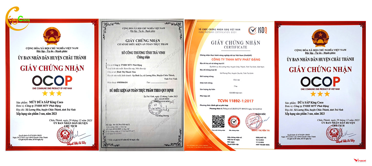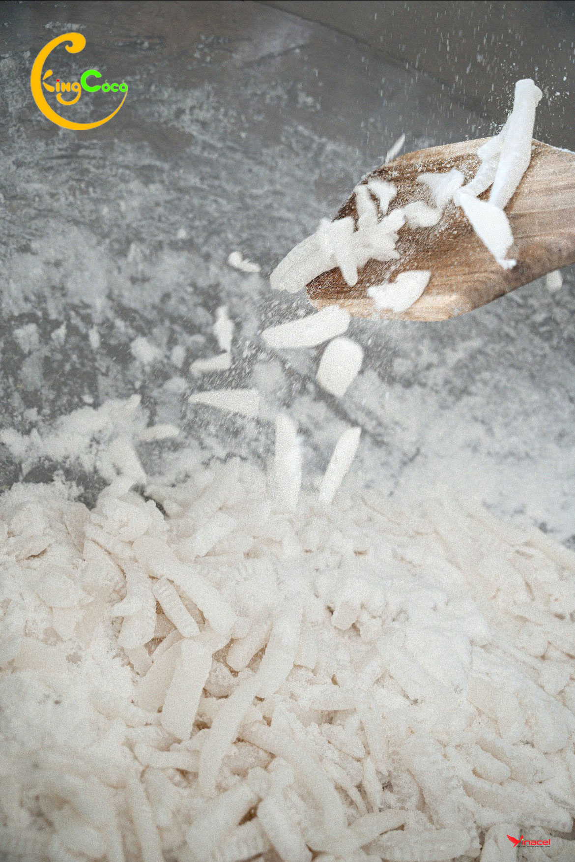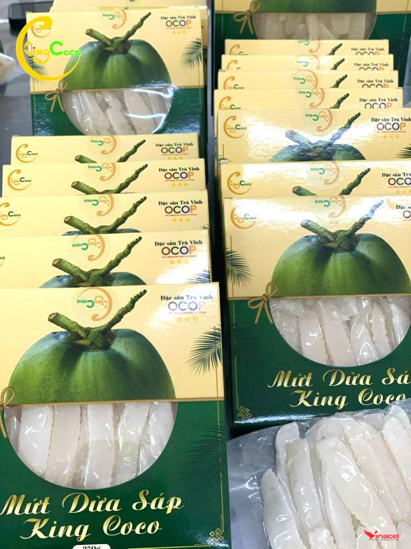 • Quy trình sản xuất Mứt Dừa Sáp King Coco cũng rất đặc biệt. Sau khi được sên kỹ với đường, cơm dừa sáp được sấy để khô nhẹ. Cuối cùng là lớp đường phía trên được cạo bỏ. Tạo nên mứt dừa sáp ít ngọt, dẻo và mềm. Điều này giúp giữ nguyên hương vị tự nhiên của dừa. Tăng thêm độ thơm ngon cho sản phẩm.