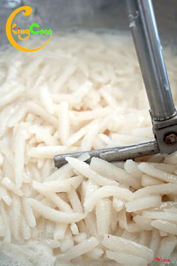• Bước 5: Bạn tiếp tục sên cho đến khi đường cạn và mứt dừa cô đặc lại thì tắt bếp. Bạn có thể thêm vani và đảo cho đến khi kết tinh đường ra hết, sợi dừa khô hẳn thì đổ dừa ra mâm để nguội và thưởng thức.