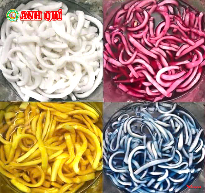 • Màu đỏ: Cà rốt cắt khúc, cho vào máy xay sinh tố, cho thêm ít nước lọc vào xay nhuyễn, lọc vắt lấy nước cốt.