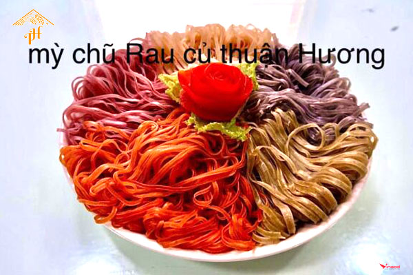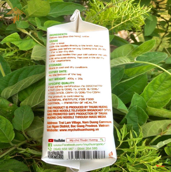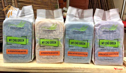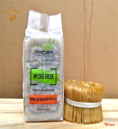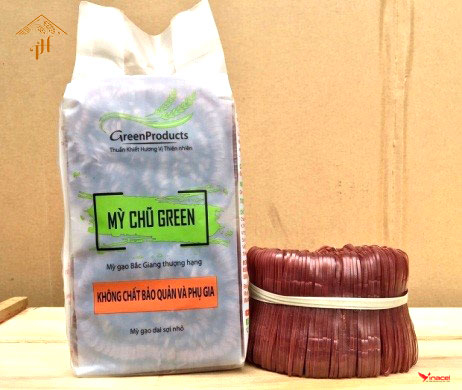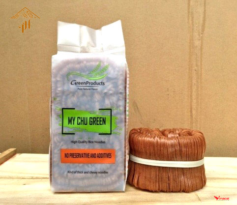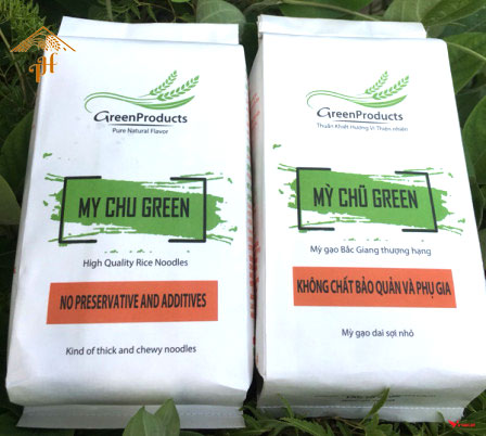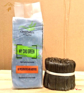 Mỳ Chũ Green (túi bóng nguyên sinh rau củ) Mỳ chũ rau củ được tạo ra từ sự kết hợp từ gạo Bao Thai đặc sản, thơm ngon nguyên chất với các loại lá, củ, quả theo mùa như chùm ngây, khoai lang, hạt điều đỏ, hoa đậu biếc, gạo lứt, mè đen, nghệ,gấc…...