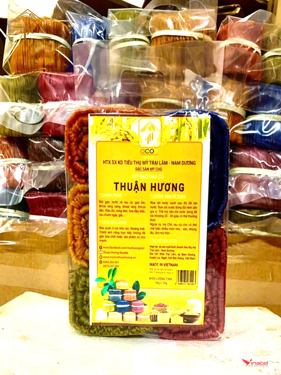 Mỳ chũ rau củ Ngũ Sắc Thuận Hương là mỳ được tạo ra từ sự kết hợp từ gạo Bao Thai đặc sản, thơm ngon nguyên chất với các loại lá, củ như chùm ngây, khoai lang, hạt điều đỏ, hoa đậu biếc, gạo lứt, mè đen, nghệ, gấc…..