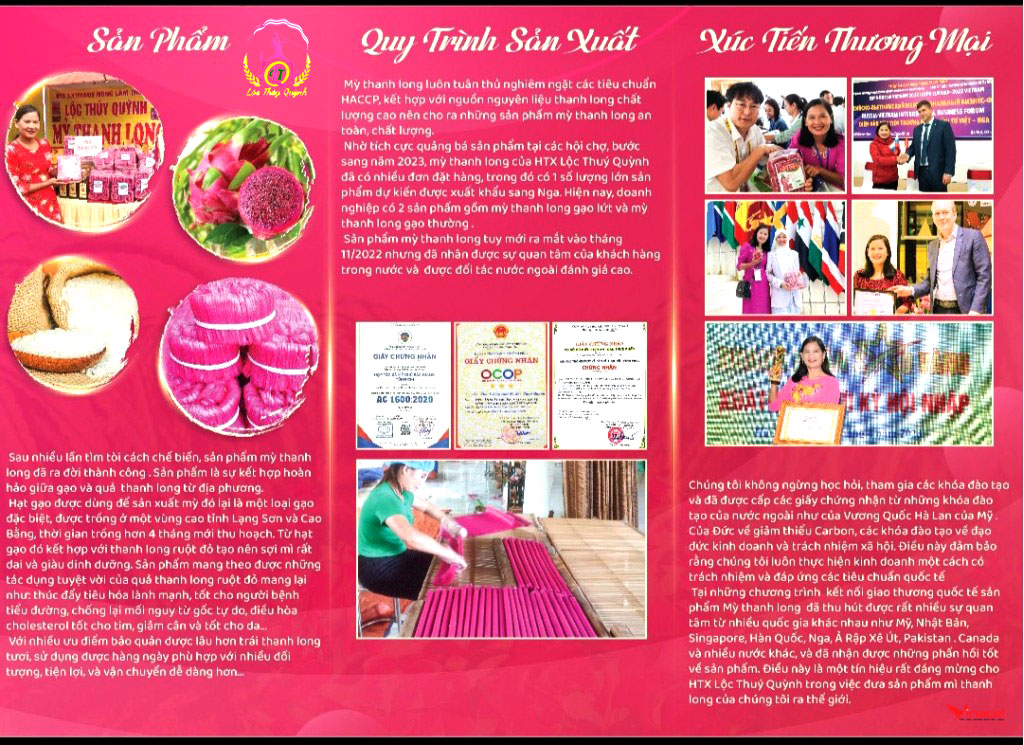 Hiện nay, Lộc Thuý Quỳnh Farm - một HTX mang tên các con tôi - đã đầu tư hệ thống sản xuất mì công nghệ cao, với quy trình sản xuất khép kín đạt tiêu chuẩn quốc tế, và sản phẩm Mì thanh long Lộc Thuý Quỳnh với nguồn nguyên liệu địa phương đạt tiêu chuẩn VietGAP đã được thị trường đón chào và sử dụng dụng rộng rãi. Mới đây, HTX Lộc thuý Quỳnh đã vinh dự nhận giải thưởng Doanh nhân Sao Vàng Xuất Sắc thời kỳ hội nhập 2023 và được chính phủ Canada đưa vào chuỗi giới thiệu sản phẩm của Canada và Việt Nam.