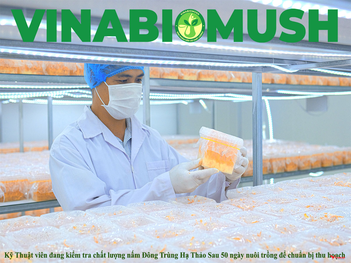 Vinabiomush ứng dụng kỹ thuật công nghệ sinh học hiện đại để sản xuất nấm Đông Trùng Hạ Thảo theo hướng hữu cơ, nhằm năng cao năng suất và chất lượng của sản phẩm. Nguyên liệu sử dụng làm giá thể nuôi trồng nấm chủ yếu là gạo lứt (trắng/nâu), với nguồn hỗn hợp dịch dinh dưỡng bổ sung vào giá thể với mục đích tạo ẩm cho môi trường nuôi trồng và cung cấp dưỡng chất cho nấm hấp thụ và sử dụng trong suốt quá trình sinh trưởng - phát triển gồm dịch chiết khoai tây, lòng đỏ trứng gà, nhộng tằm, peptone, cao nấm men, dầu đậu nành, đường saccharose,....