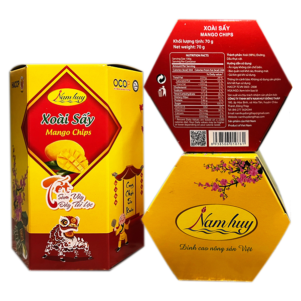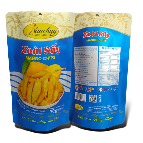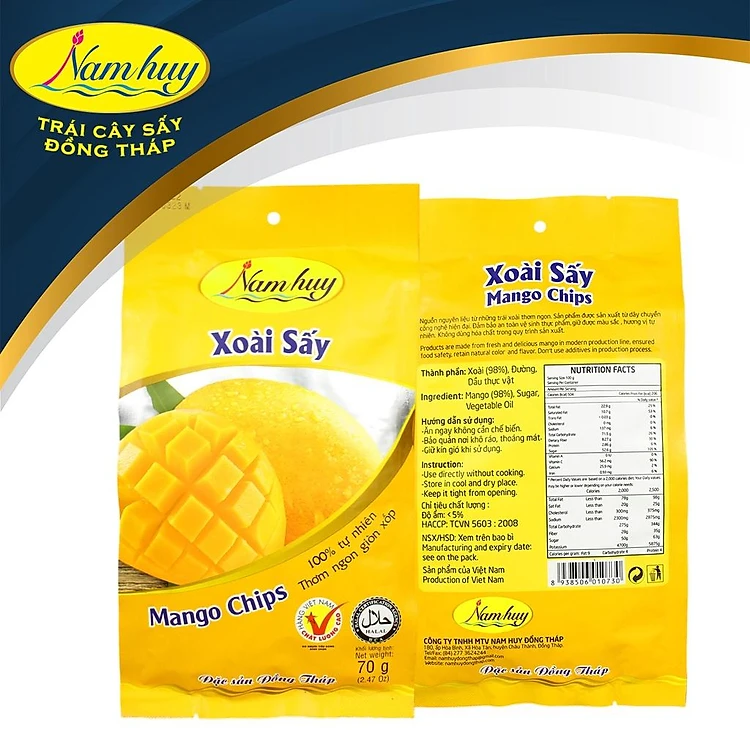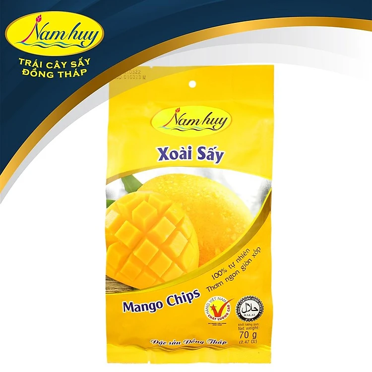 Hãy đến với “Xoài sấy Nam Huy” tại xã Hòa Tân, huyện Châu Thành, tỉnh Đồng Tháp sản xuất trên dây sấy chân không hiện đại, miếng xoài vẫn giữ được hương vị tươi ngon tự nhiên, giúp giữ trọn hương vị tự nhiên mang lại cảm giác cực ngon khi sử dụng lại vừa tốt cho sức khỏe. Xoài Sấy là một sản phẩm cô đặc các chất dinh dưỡng màu sắc và hương vị của quả xoài tươi tự nhiên, tạo nên sản phẩm thơm ngon hấp dẫn, tiện lợi cho người tiêu dùng.