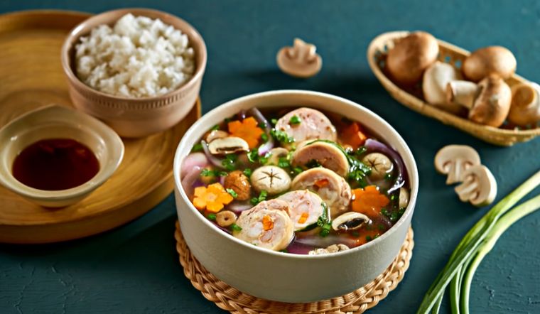 Bạn trải miếng thịt gà vừa cắt lát, sau đó phết giò sống lên và cuộn tròn lại buộc bằng chỉ. Đun sôi nồi nước dùng, có thể làm nước dùng từ xương lợn hoặc xương gà đều được. Khi nước sôi bạn thả thịt gà vào nấu chín, tiếp theo cho nấm cùng rau củ quả vào đun trên bếp tầm 5 phút là được. Bắc nồi canh thịt gà nấm rơm ra và nêm ít rau thơm cùng gia vị vào sao cho vừa ăn là được.