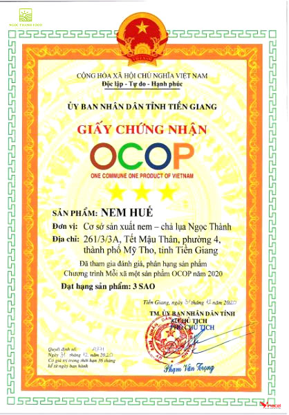Nem chua Huế Ngọc Thành là sản phẩm 0C0P chất lượng cao, được xác nhận sản phẩm chuỗi cung ứng thực phẩm an toàn; có nguồn gốc và xuất xứ rõ ràng, đảm bảo vệ sinh an toàn thực phẩm.
