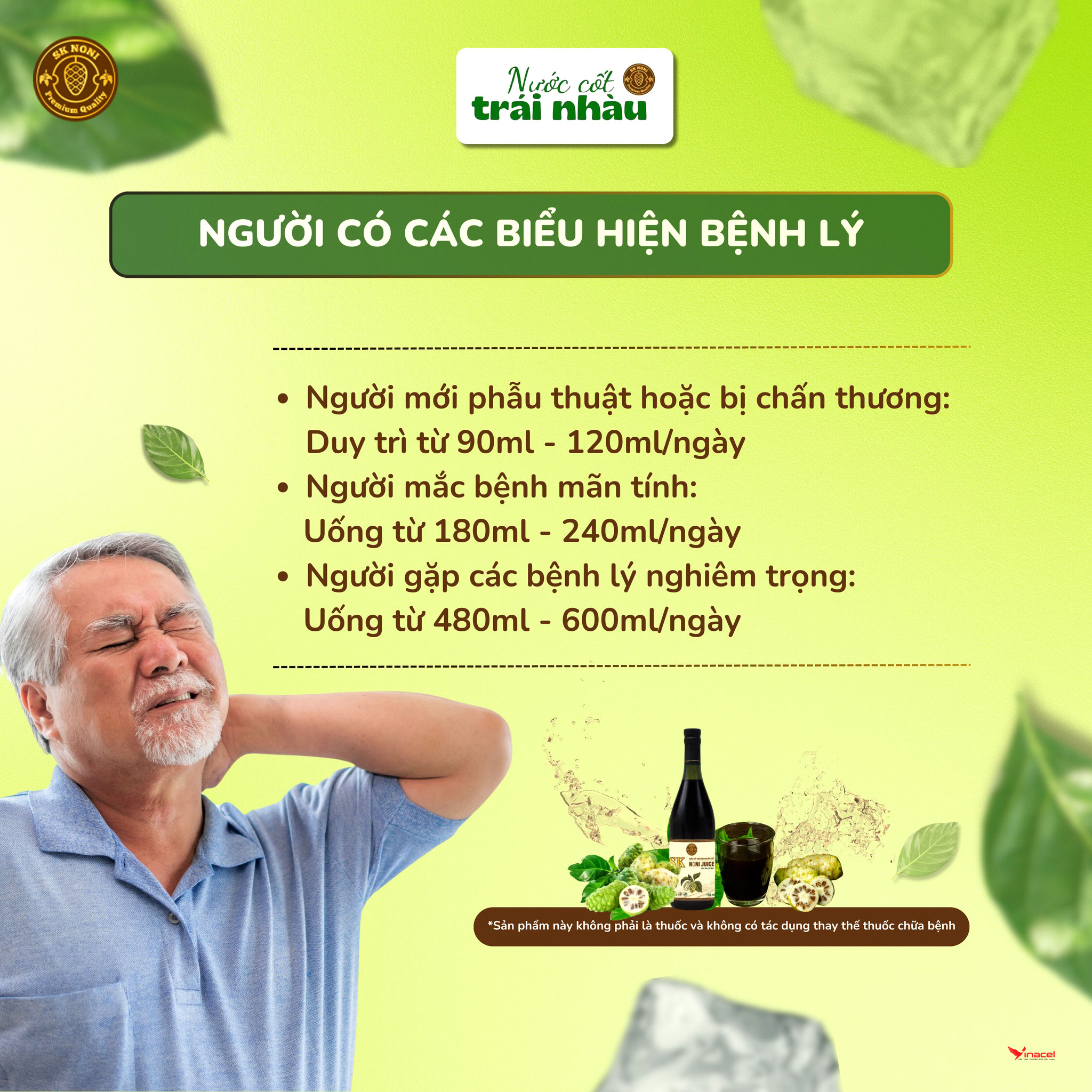• Người lớn: 30 ml & Trẻ em: 15 ml nước cốt trái nhàu mỗi ngày. Liều dùng có thể thay đổi tùy tình trạng sức khỏe và khả năng đáp ứng của cơ thể.
