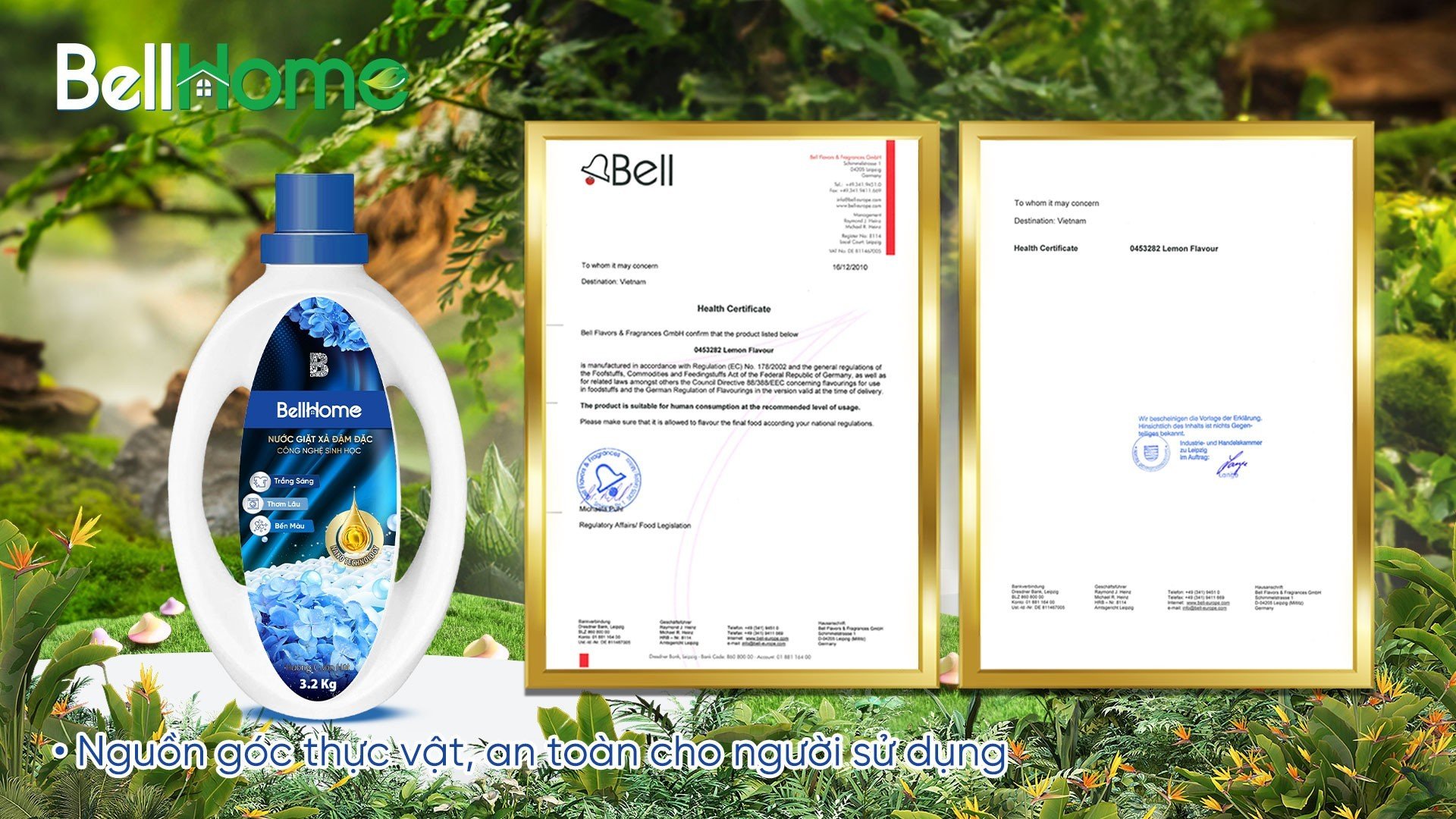 - Các sản phẩm Bell Home được chiết xuất từ thiên nhiên với công nghệ sinh học mới nhất từ công ty Bell Flavors & Fragrances - thương hiệu có bề dày lịch sử và luôn giữ vị thế trong ngành tẩy rửa trong suốt thời gian qua.