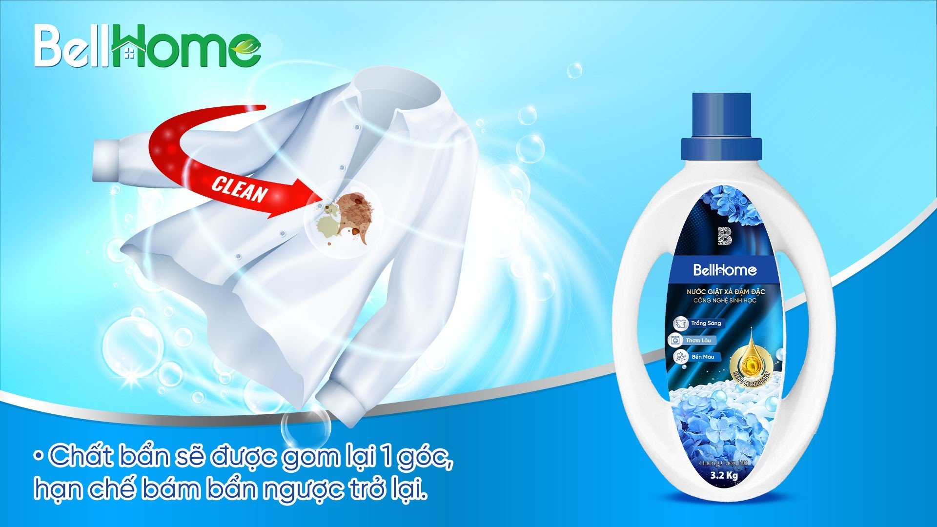 Nhờ ứng dụng công nghệ sinh học và khả năng lưu hương gần như tương đương với các sản phẩm nước hoa cao cấp sang trọng, nước giặt công nghệ sinh học Bell Home giúp quần áo ngâm qua đêm không bị hôi thối, trời nồm không mùi khó chịu.