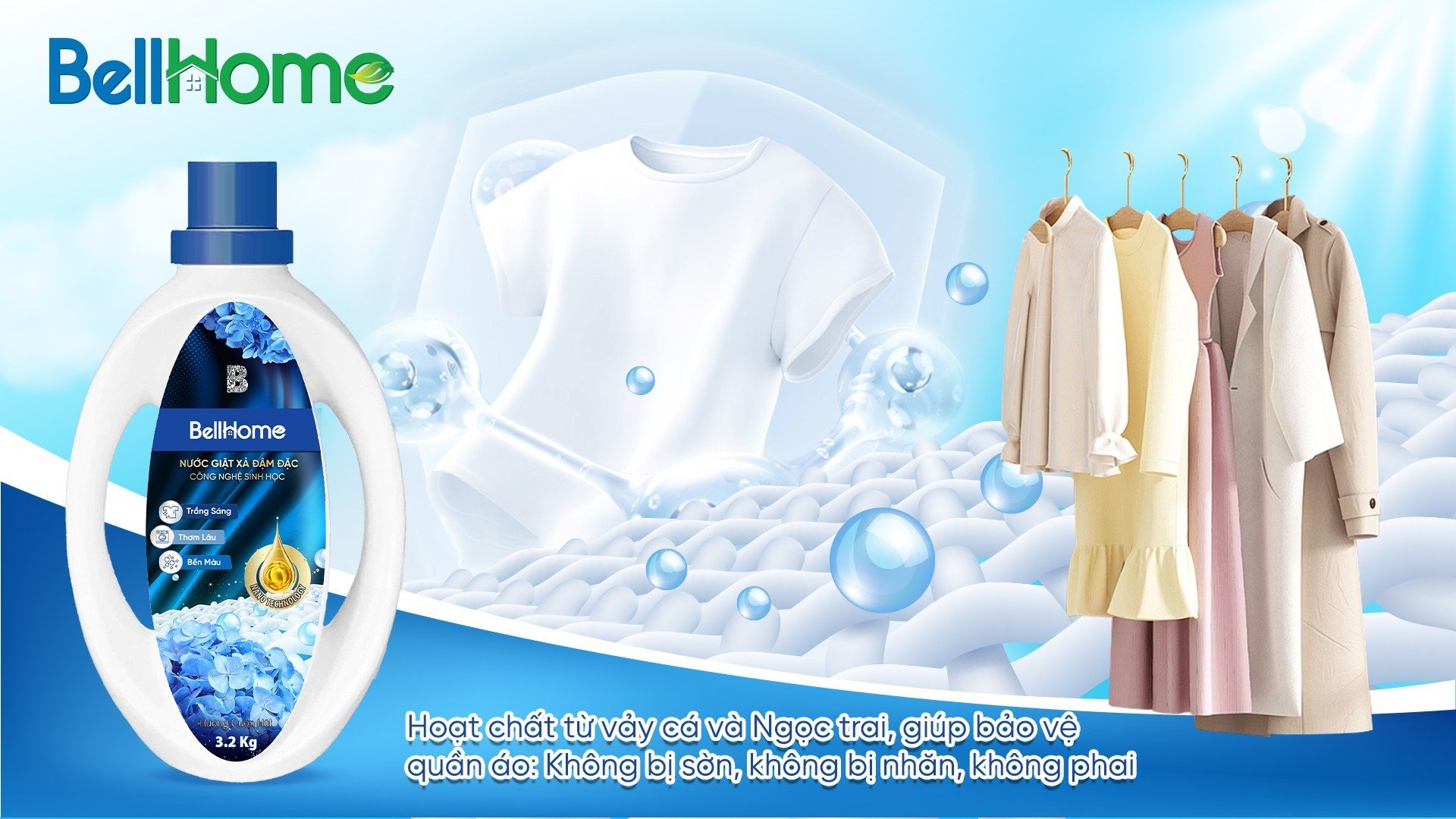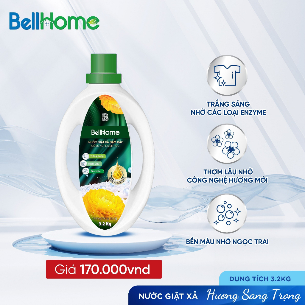 Nếu chị em nào đang gặp các vấn đề như quần áo trắng tinh bị ngả màu tối cũ sau một thời gian giặt rửa với nước giặt thông thường, đặc biệt là những món đồ hàng hiệu, đắt tiền. Thì nay Bell Home được thừa hưởng toàn bộ những công nghệ sinh học hiện đại nhất từ Viện Hóa Học Đức với đầy đủ các giấy tờ quốc tế, cùng với chiết xuất từ Ngọc trai, vẩy cá tạo sáng lấp lánh giúp bảo vệ bề mặt áo quần không làm bài sờn, không phai màu sợi vải, không ố vàng và ngả màu sau 1 thời gian giặt rửa. Thêm vào đó các thành phần từ chiết xuất tinh dầu Macca, hạnh nhân, tinh dầu dừa và tinh dầu cà phê giúp bảo vệ da tay khỏi bị nứt nẻ, thô ráp và dưỡng da mềm mại trắng hồng tự nhiên trong quá trình chị em tiếp xúc trực tiếp da tay với dung dịch nước giặt từ Bell Home.