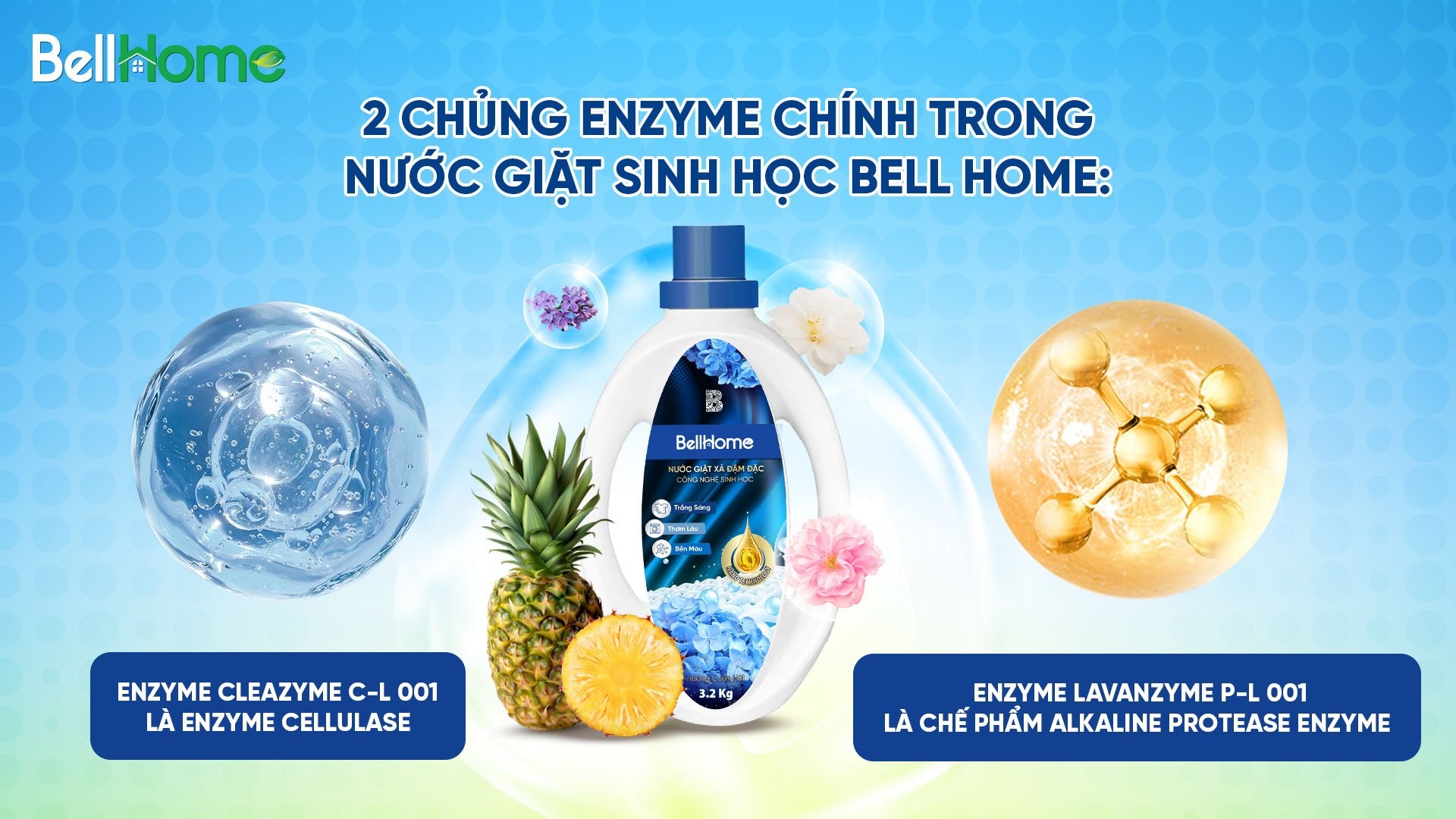 Trong nước giặt sinh học Bell Home, có 2 chủng Enzyme chính. Enzyme đầu tiên Cleazyme C-L 001 là enzyme cellulase dạng lỏng có tính kiềm được sử dụng trong công thức sản xuất nước giặt sinh học Bell Home thế hệ mới. Trong các nghiên cứu khoa học đã cho thấy, cellulase có khả năng ngăn ngừa và loại bỏ hiệu quả các sợi lông tơ nhỏ và các sợi tơ vón cục trên bề mặt vải xenlulo. Nó cũng giúp ích rất nhiều trong việc loại bỏ các hạt bụi bẩn tận sâu bên trong, ngăn chặn sự lắng đọng của các vết bẩn dạng hạt trên vải bông. Chính vì vậy, sau khi giặt bằng cellulase, quần áo sẽ có màu sắc tươi sáng và mềm mại hơn.