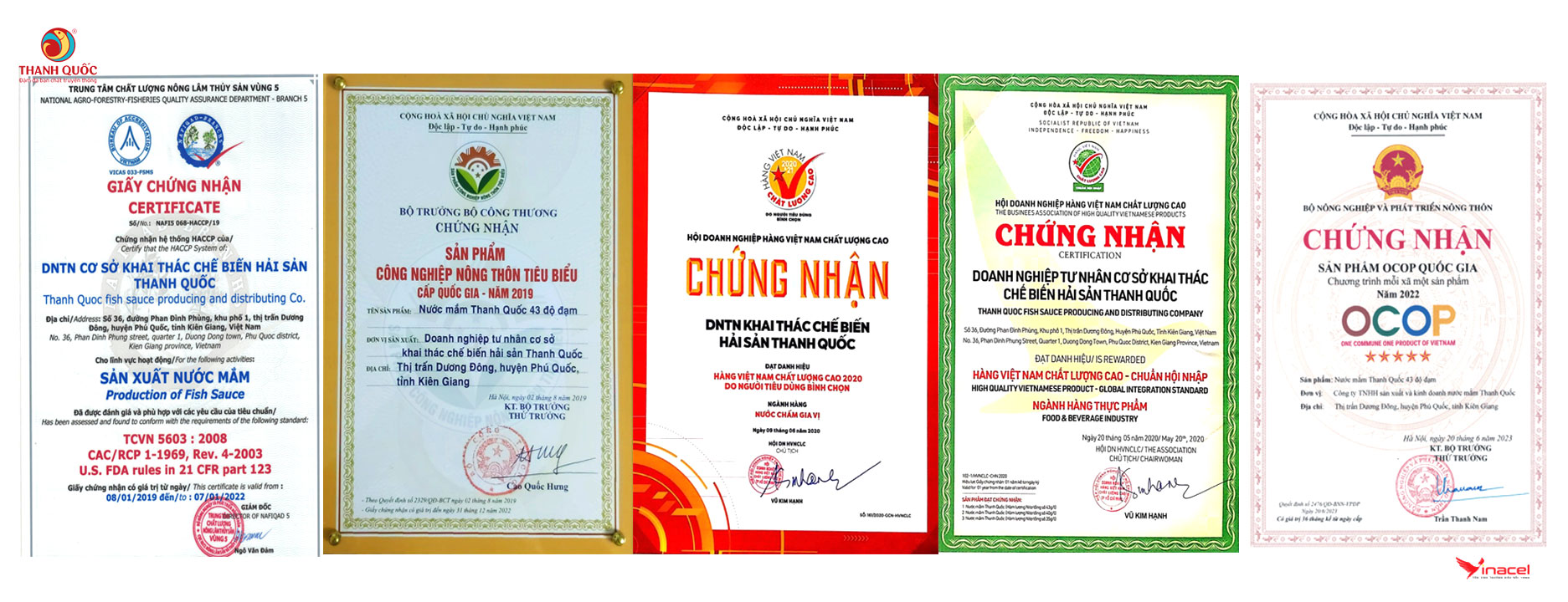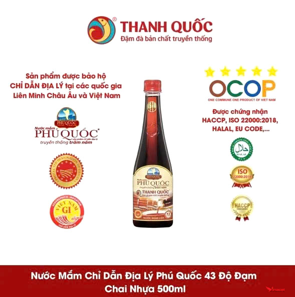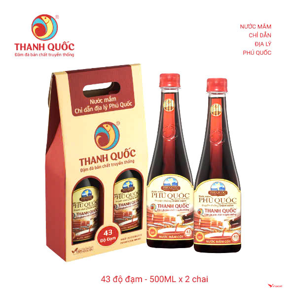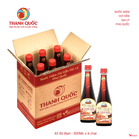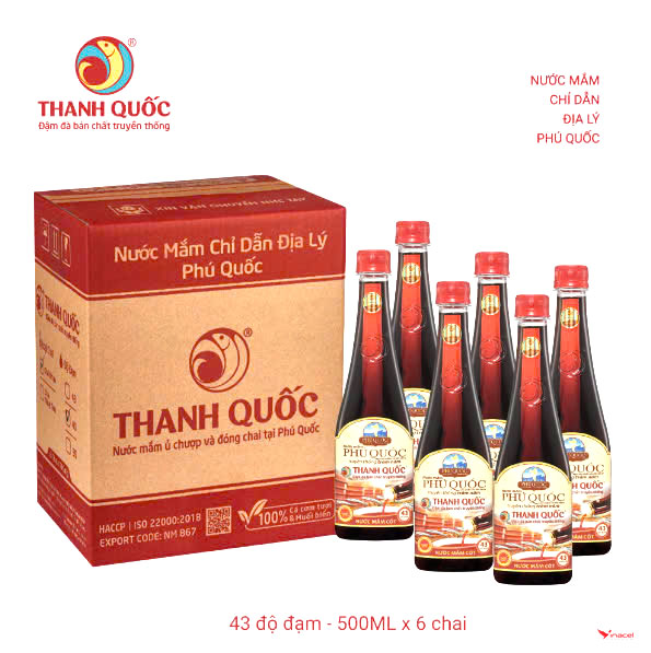 Nước mắm chỉ dẫn địa lý Phú Quốc - Thanh Quốc 43 độ đạm là sản phẩm được Liên Minh Châu Âu và Việt Nam bảo hộ chỉ dẫn địa lý nguồn gốc xuất xứ “Phú Quốc”. Sản phẩm được sản xuất theo tiêu chuẩn vệ sinh an toàn thực phẩm quốc tế HACCP, ISO 22000:2018, và HALAL.