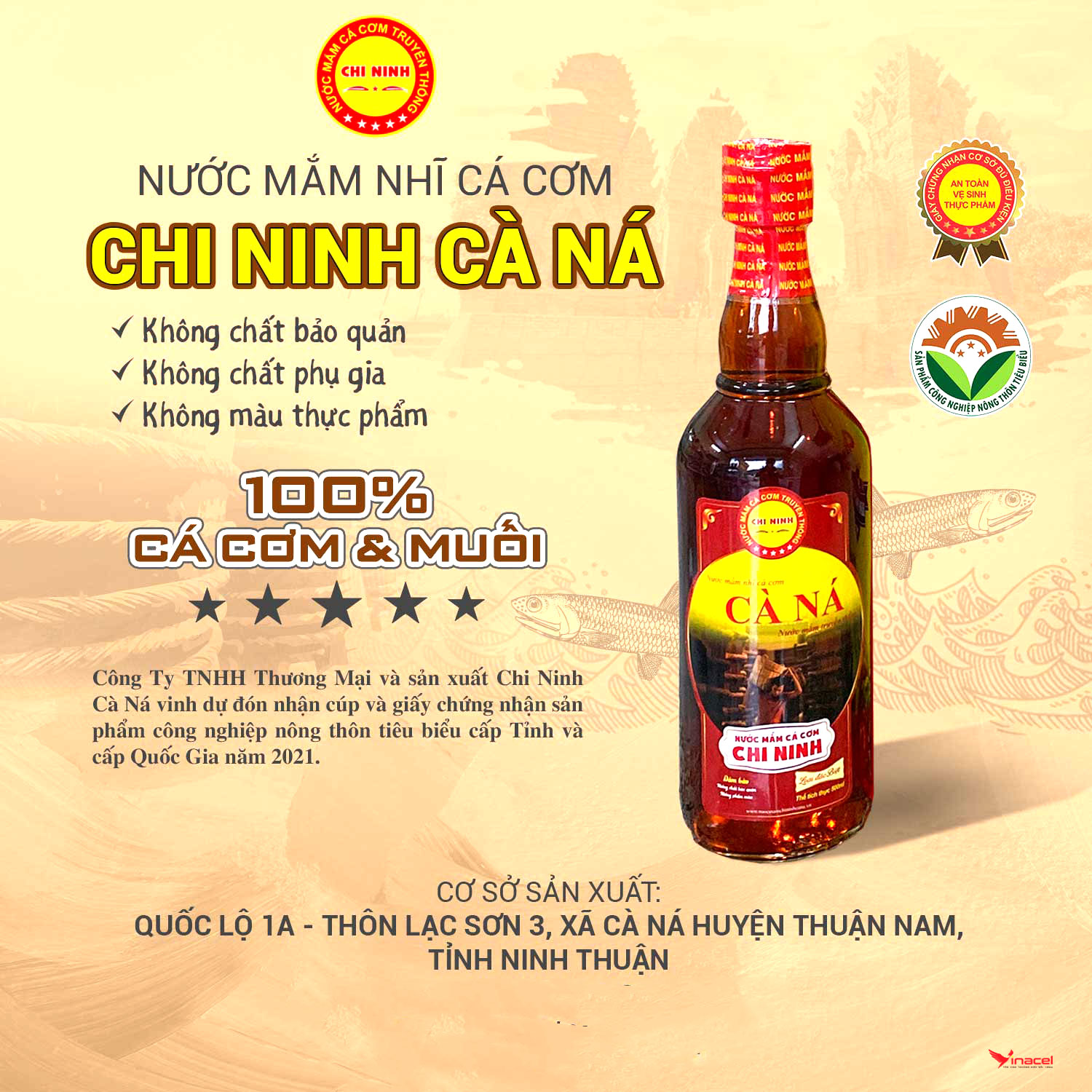 Nước mắm Cà Ná thương hiệu Nước mắm Chi Ninh sản xuất theo quy trình truyền thống, có hương thơm tự nhiên tinh tế và vị mặn nhẹ nhàng, nhiều chất dinh dưỡng và được ứng dụng rộng rãi trong ẩm thực truyền thống, mang đến hương thơm đậm đà vị cho nhiều món ăn.