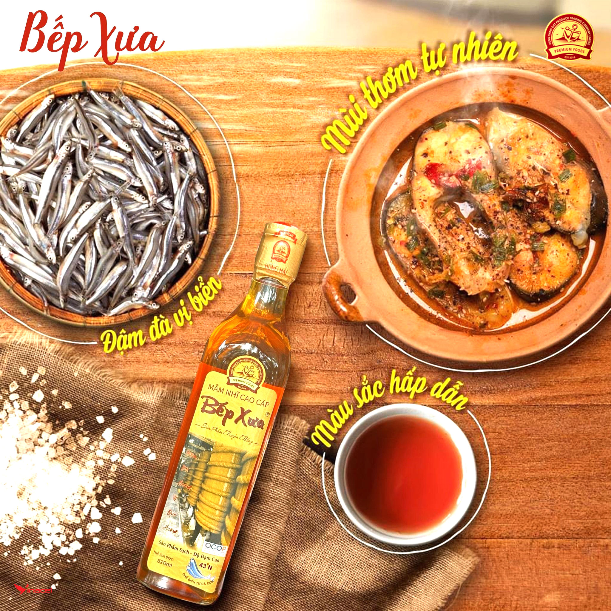 Nước mắm nhĩ cao cấp BẾP XƯA được sản xuất theo phương pháp truyền thống ướp chượp từ nguồn cá cơm đặc trưng ở vùng biển Tam Quan – Bình Định với tiêu chí mang đến hương vị mắm nhĩ đậm đà hơn trong từng bữa cơm. Sản phẩm đầy đủ kiểm nghiệm, chứng nhận sản phẩm chất lượng an toàn bởi các cơ quan thẩm quyền của nhà nước, và đã công bố tên sản phẩm Nước mắm nhĩ cao cấp BẾP XƯA rộng rãi trên thị trường.