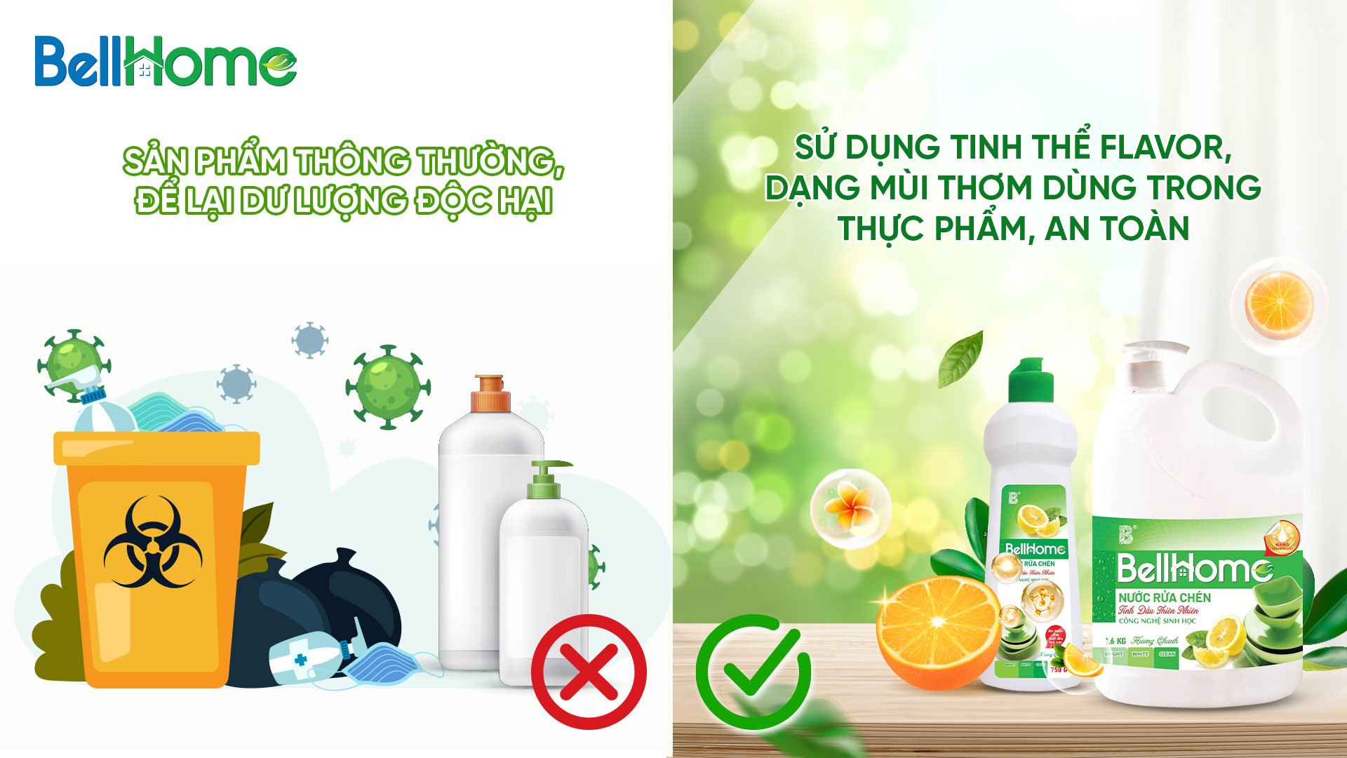 Khác với các sản phẩm nước rửa chén trên thị trường thường sử dụng các chất tạo hương có thể gây độc hại khi sử dụng thì đối với sản phẩm nước rửa chén sinh học Bell Home thì hương thơm được tạo nên bởi các tinh dầu tự nhiên. Đó là hương thơm dịu nhẹ của hoa quả, thảo dược tự nhiên, nhẹ nhàng hương thơm bền lâu.