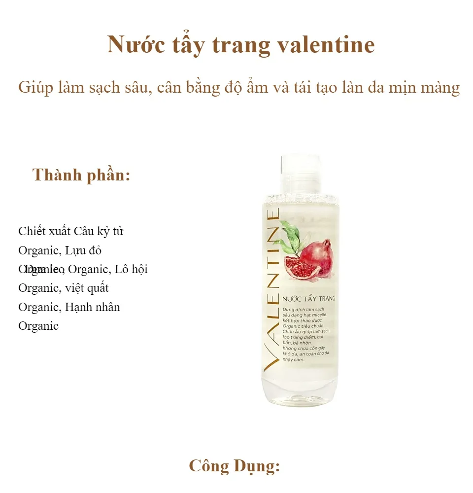 - Làm sạch sâu: Sử dụng công nghệ Micellar chứa vô số các hạt micelle giúp làm sạch sâu, hiệu quả Chiết xuất từ các thảo dược Organic thiên nhiên: an toàn cho da không gây kích ứng.