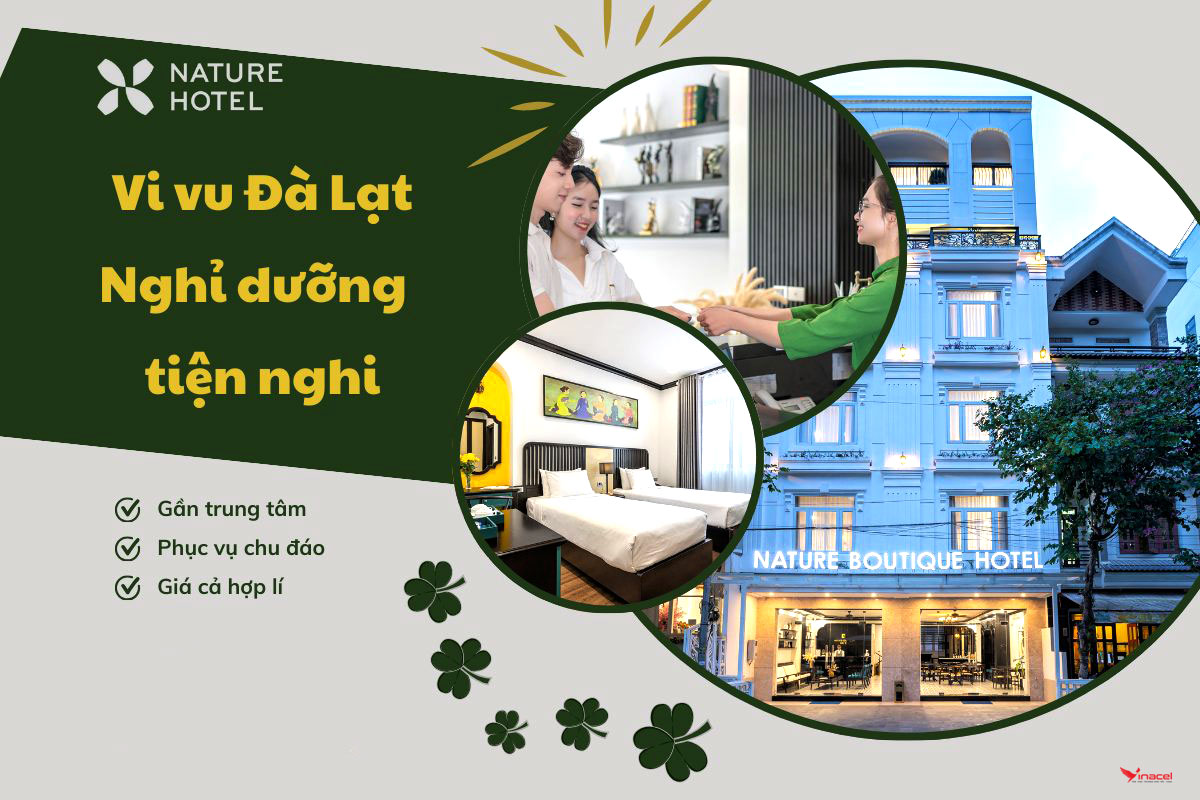 Nature Boutique Hotel - Đà Lạt là một trong những khách sạn thuộc tập đoàn Nature Hospitality nổi tiếng với những nơi lưu trú có mặt ở các thành phố, tỉnh thành lớn. Khách sạn sở hữu vị trí đắc địa nằm ngay tuyến đường Nguyễn Thị Nghĩa, trung tâm thành phố. Chọn Nature Boutique Hotel, du khách có thể dễ dàng di chuyển đến các địa điểm nổi tiếng như: Quảng trường Lâm Viên, hồ Xuân Hương, Ga Đà Lạt, Biệt thự Hằng Nga...