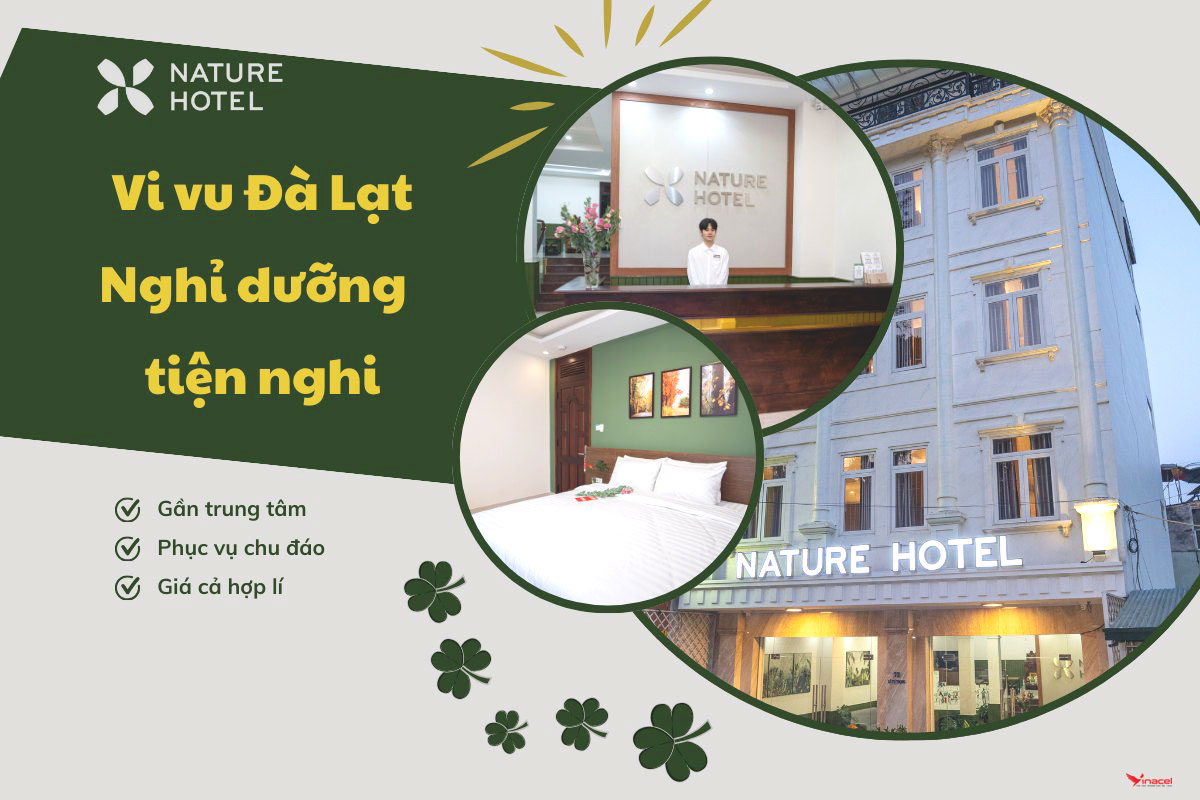Tọa lạc trên cung đường nghệ thuật nổi tiếng tại trung tâm thành phố, Nature Hotel không chỉ đem đến cho bạn cảm giác thư giãn tuyệt đối trong không gian yên bình, mà còn mang lại sự thuận tiện với sự di chuyển dễ dàng đến các điểm du lịch nổi tiếng như Hồ Xuân Hương, Chợ Đà Lạt.