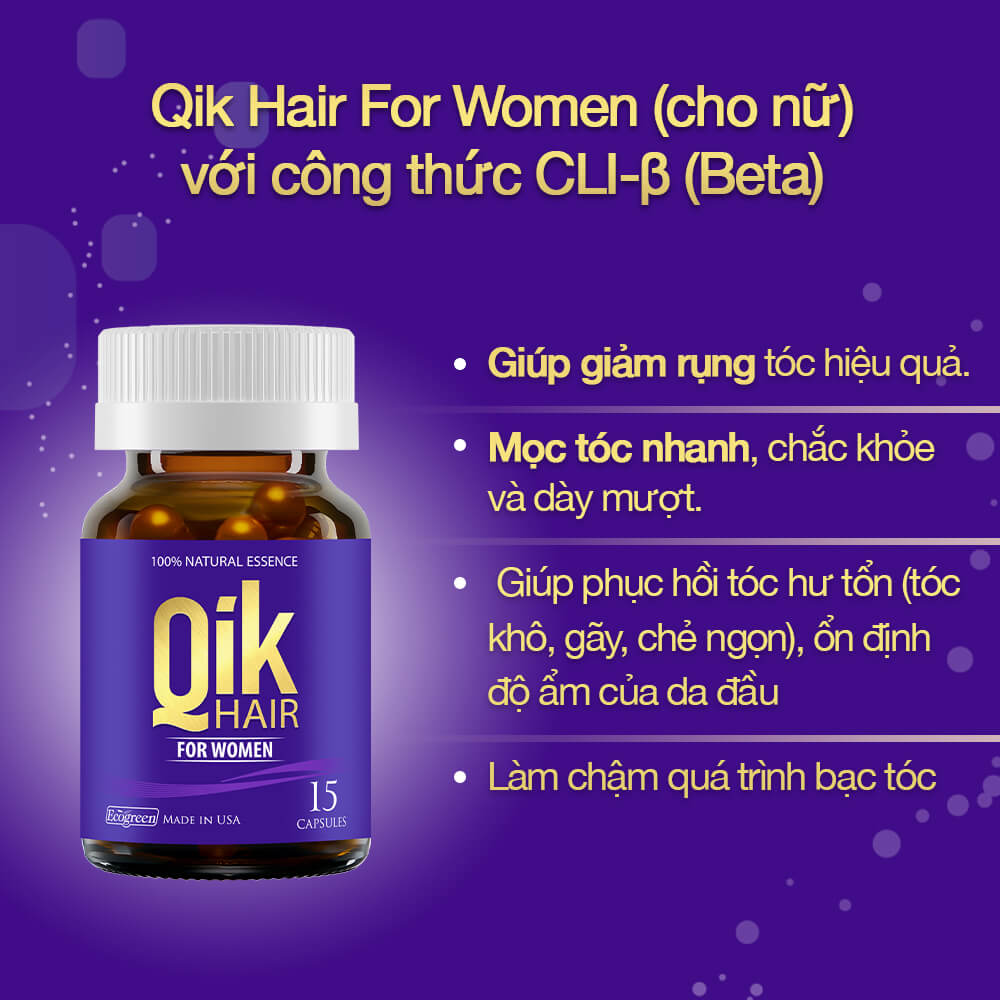 Qik (For Women) với công thức chuyên biệt cho nữ giới, chứa các tinh chất thiên nhiên, giúp cân bằng hệ thần kinh nội tiết và tăng trưởng tế bào mầm tóc