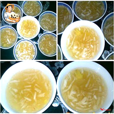 • Khi đã sôi ta hạ lửa khuấy đều chờ tầm 5 phút cho đường phèn và gừng vào sau đó tắt bếp. Múc ra chén để nguôi nó sẽ tự đông lại là có thể dung được rồi.