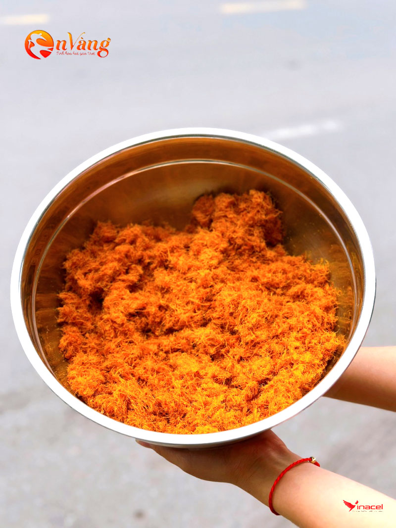 o Ruốc có màu vàng ruộm, sợi ruốc không bị mủn quá, ngắn quá, bông mịn, không có các cục thịt vón vào nhau.