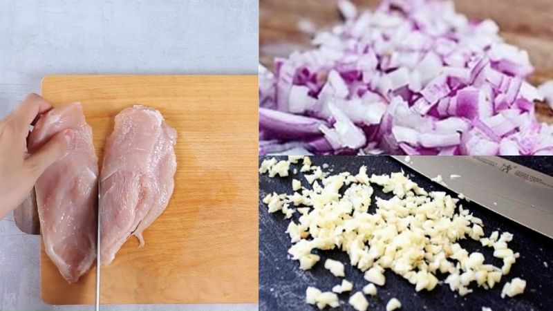 o Thịt gà được rửa sạch, để ráo nước. Thái thịt gà thành từng miếng có kích thước bằng bao diêm nhưng mỏng hơn.