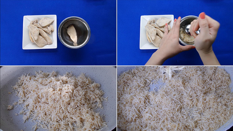 o Cho thịt gà được xé lên chảo đảo qua để phần nước khi giã thịt được hong khô.